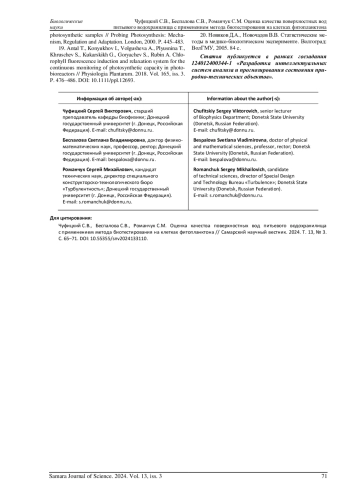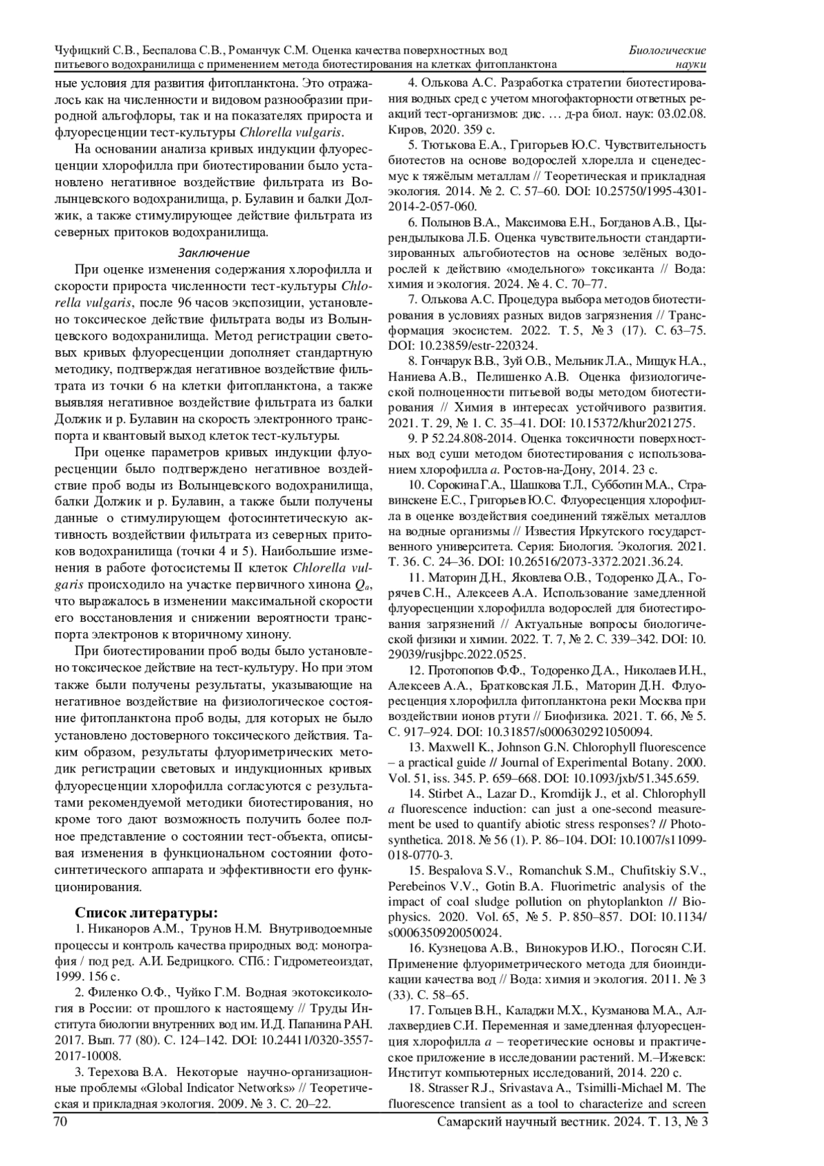 12. Протопопов Ф.Ф., Тодоренко Д.А., Николаев И.Н., Алексеев А.А., Братковская Л.Б., Маторин Д.Н. Флуоресценция хлорофилла фитопланктона реки Москва при воздействии ионов ртути // Биофизика. 2021. Т. 66, № 5. С. 917-924. DOI: 10.31857/s0006302921050094 EDN: ODEOKP