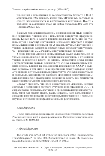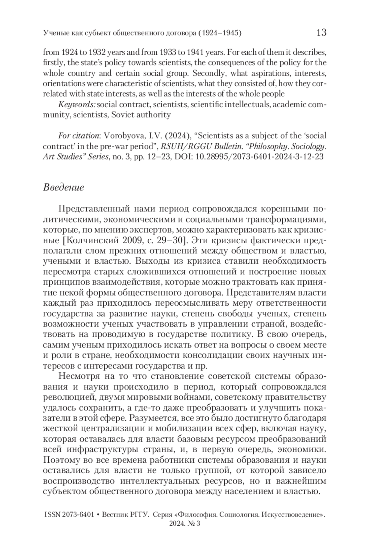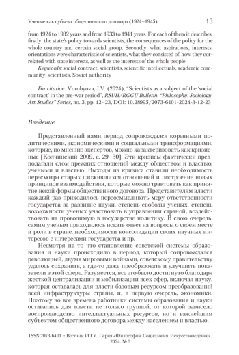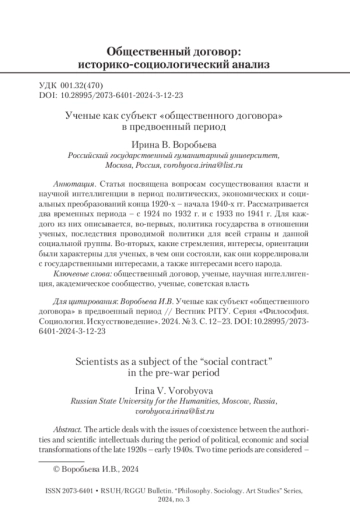 Статья посвящена вопросам сосуществования власти и научной интеллигенции в период политических, экономических и социальных преобразований конца 1920-х – начала 1940-х гг. Рассматривается два временных периода – с 1924 по 1932 г. и с 1933 по 1941 г. Для каждого из них описывается, во-первых, политика государства в отношении ученых, последствия проводимой политики для всей страны и данной социальной группы. Во-вторых, какие стремления, интересы, ориентации были характерны для ученых, в чем они состояли, как они коррелировали с государственными интересами, а также интересами всего народа.