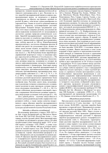 В статье приведены результаты четырехлетнего изучения 29 образцов зверобоя продырявленного разного географического происхождения в условиях культуры среднетаежной подзоны Республики Коми. Выявлена высокая зимостойкость растений зверобоя продырявленного первого-второго годов жизни. Отмечено значительное снижение зимостойкости большинства изучаемых образцов (до 41-68%) на третий и четвертый годы перезимовки растений. Выявлено пять зимостойких образцов - Таллин 885 и 886 (100%), Йошкар-Ола, Осло 219 и Таллин 888 (90%). Установлено, что все растения зверобоя продырявленного, выращенные рассадным способом, переходят в генеративный период на второй год жизни, регулярно цветут и плодоносят. Исследование сезонного развития зверобоя продырявленного показало, что образцы разного географического происхождения сохраняют фенологические ритмы, свойственные данному виду. Растения зверобоя продырявленного характеризуются длительными периодами цветения (39-57) и плодоношения (37-59 дней). Вегетационный период большинства образцов в зависимости от метеоусловий сезона длится 126-142 дня. Выделился один образец Таллин 885 с более коротким вегетационным периодом (100-128 дней). Приведена морфометрическая характеристика генеративного побега всех образцов у растений второго-четвертого годов жизни. Максимальные показатели флоральной части побега отмечены у образцов Барнаул, Йошкар-Ола, Сыктывкар, Таллин 885, минимальные - у сорта Солнечный и Лейпциг 379. Максимального развития растения достигали на третий год жизни. Определено суммарное содержание гиперицина и псевдогиперицина (0,04-0,06%) в растениях зверобоя продырявленного разного географического происхождения. Выявлено высокое содержание флавонолов (4,8-5,8%) в надземной сырьевой фитомассе изучаемых образцов зверобоя разного географического происхождения.