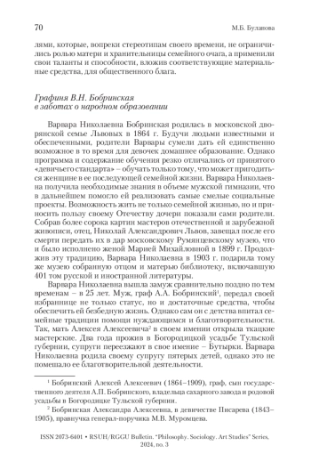 В статье рассматриваются проекты в области образования, предложенные и реализованные тремя женщинами-благотворителями в конце XIX – начале XX в. Графиня В. Н. Бобринская (1864–1940) в своем имении Бутырки Тульской губернии организовала для местных крестьянских детей воскресную школу, а для их родителей – школу обучения чтению. Кроме того, она возглавила Комиссию заграничных и русских экскурсий, устроив поездки, благодаря которым сельские учителя получили возможность поработать над повышением своего образовательного и культурного уровня. Княгиня М. К. Тенишева (1858–1928) открыла в Бежице Смоленской губернии Школу ремесленных учеников, осваивающих профессии столяра, кузнеца, чертежника. Также ей удалось открыть на хуторе Флёново 6-летнюю сельскохозяйственную школу для местных крестьянских детей. Наконец, Лидия Алексеевна Шанявская (1842–1921) приложила немало сил для открытия в 1908 г. Московского народного университета. Тем самым эти образованные, достойные женщины внесли посильный вклад в развитие российского народного образования.