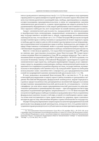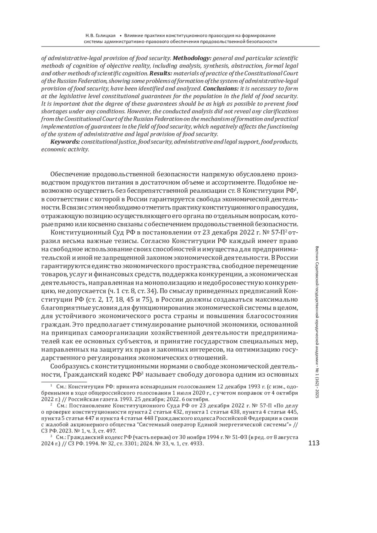 Обеспечение продовольственной безопасности напрямую обусловлено производством продуктов питания в достаточном объеме и ассортименте. Подобное невозможно осуществить без беспрепятственной реализации ст. 8 Конституции РФ1, в соответствии с которой в России гарантируется свобода экономической деятельности. В связи с этим необходимо отметить практику конституционного правосудия, отражающую позицию осуществляющего его органа по отдельным вопросам, которые прямо или косвенно связаны с обеспечением продовольственной безопасности.
