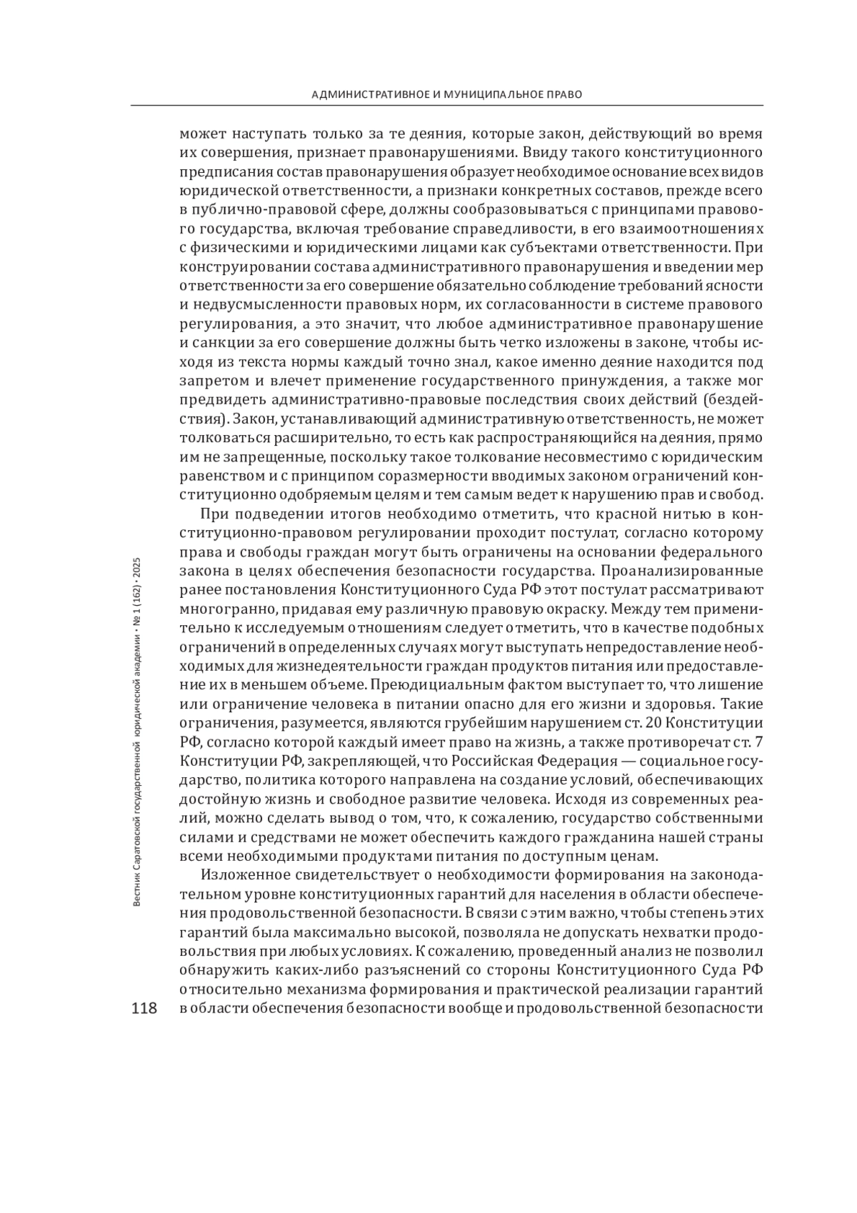 Вывод: необходимо формирование на законодательном уровне конституционных гарантий для населения в области обеспечения продовольственной безопасности. Важно, чтобы степень этих гарантий была максимально высокой для недопущения нехватки продовольствия при любых условиях. Однако проведенный анализ не позволил обнаружить каких-либо разъяснений со стороны Конституционного Суда РФ относительно механизма формирования и практической реализации гарантий в области обеспечения продовольственной безопасности, что отрицательно влияет на функционирование системы административно-правового обеспечения продовольственной безопасности.