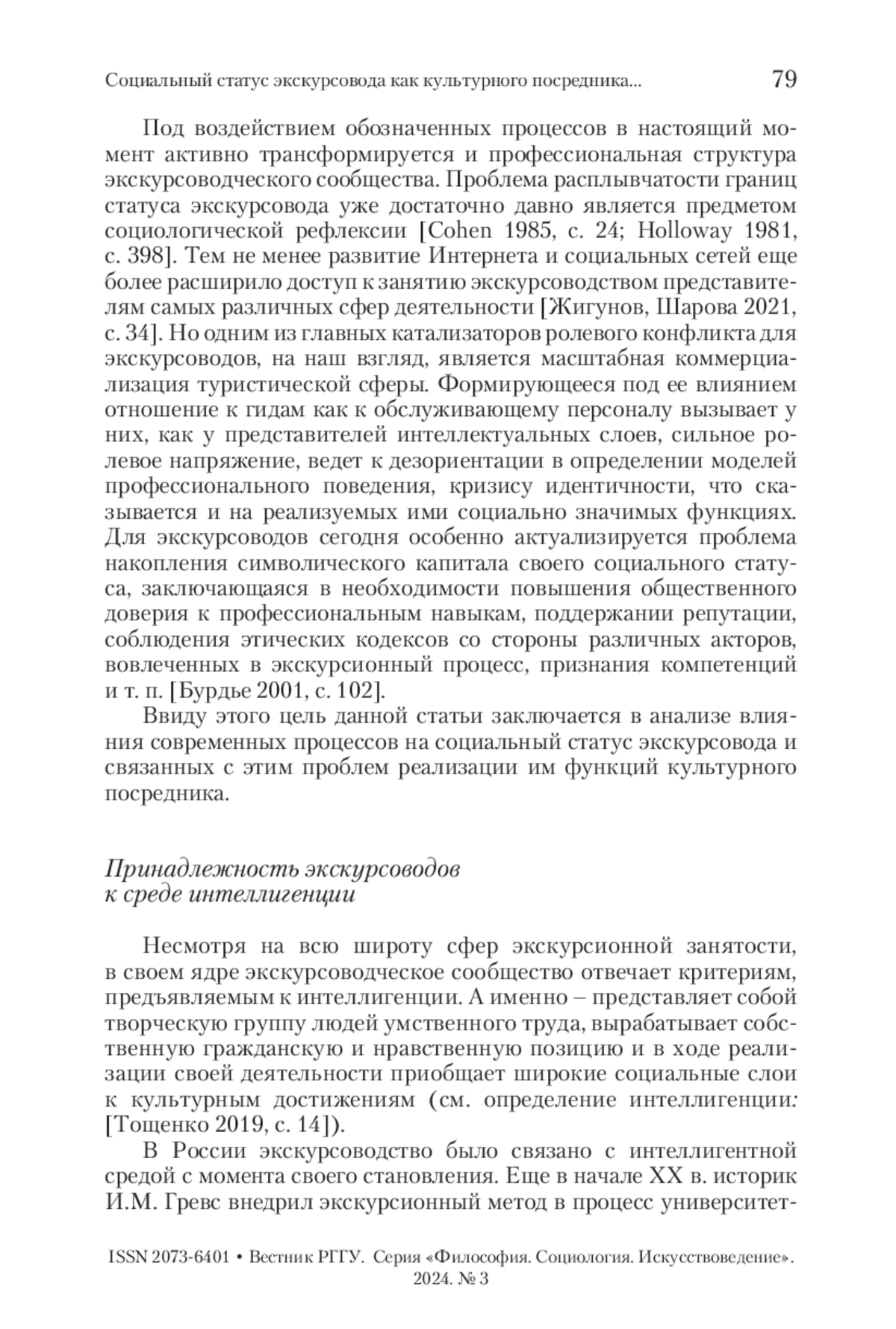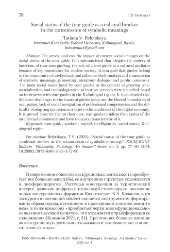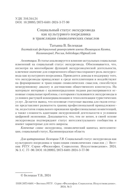 В статье анализируется влияние актуальных социальных изменений на социальный статус экскурсовода. Обосновывается, что, несмотря на многообразие функций экскурсоводческой деятельности, ключевое значение для современного общества сохраняет роль экскурсовода как культурного посредника. Приводятся доводы в поддержку того, что экскурсоводы принадлежат к среде интеллигенции и воздействуют на формирование и трансляцию символических смыслов, способствуя межгрупповому диалогу и достижению общественного консенсуса. На материале интервью с калининградскими гидами рассматриваются основные социальные проблемы, с которыми сталкиваются экскурсоводы в условиях растущей коммерциализации и технологизации туристических услуг. Делается вывод, что основные статусные вызовы для гидов сегодня представляют размытость границ профессиональной принадлежности, недостаток социального признания профессиональных компетенций, а также сложность адаптации экскурсионной деятельности к условиям цифровой экономики. Доказывается, что, тем не менее, в своей основе экскурсоводы подтверждают статус интеллектуального сообщества и имеют характерные для него запросы.