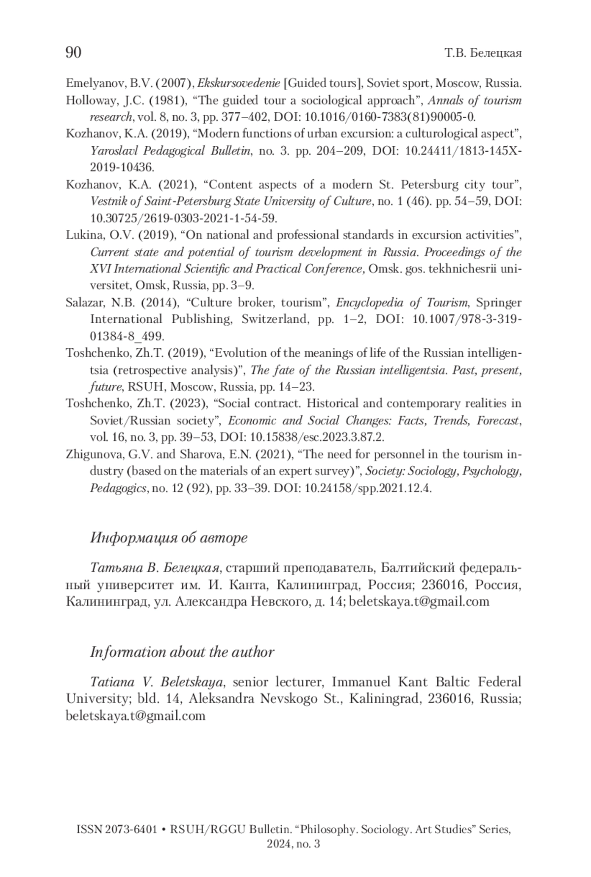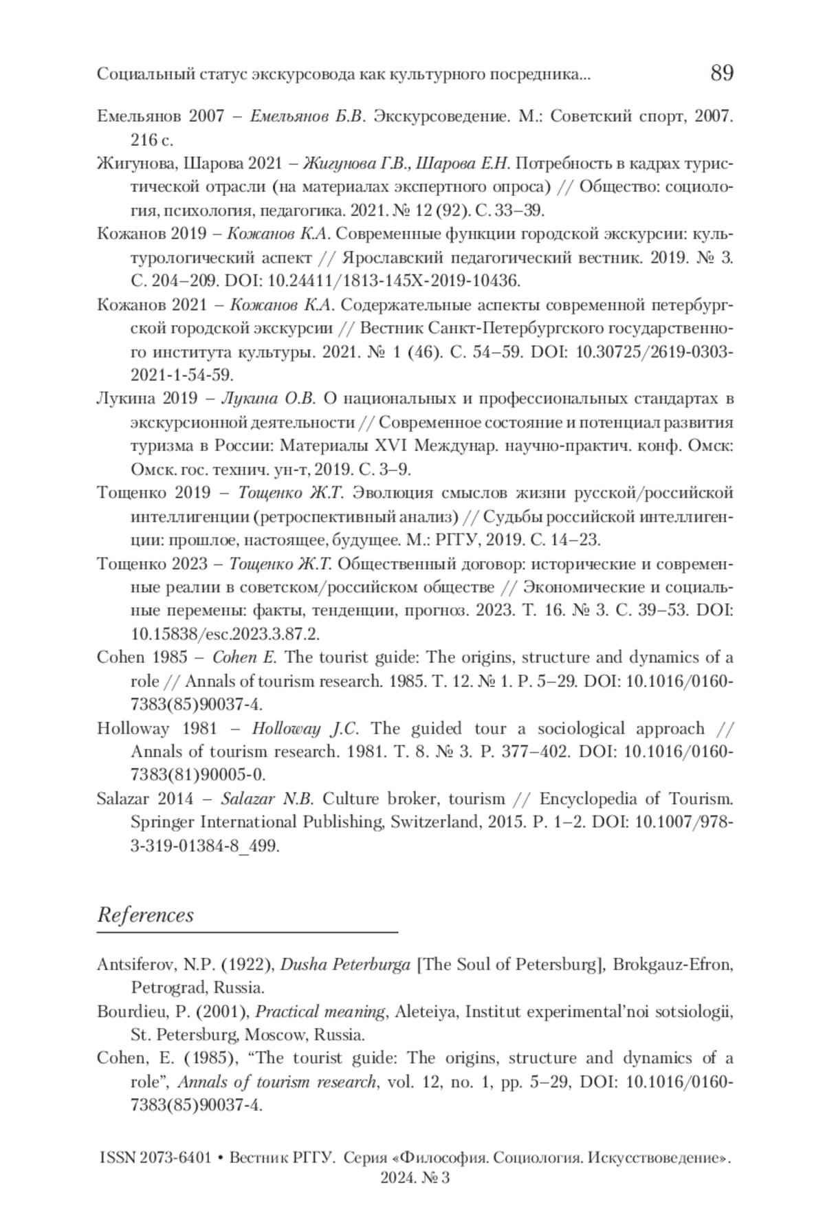 10. Cohen 1985 - Cohen E. The tourist guide: The origins, structure and dynamics of a role // Annals of tourism research. 1985. Т. 12. № 1. P. 5-29. https://doi.org/10.1016/0160-7383(85)90037-4.
