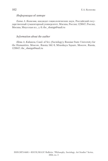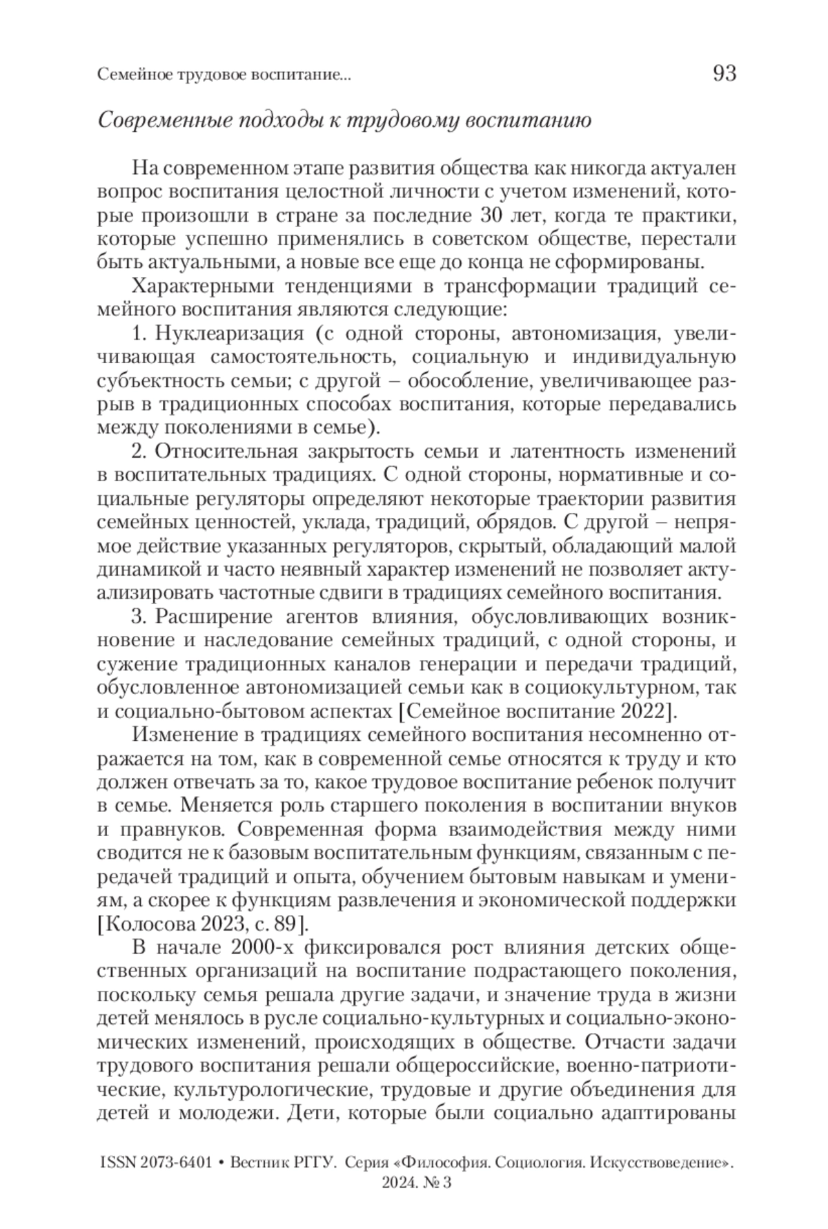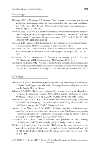 2. Колосова 2023 - Колосова Е.А. Воспитание детей: о необходимости нового социологического ракурса теоретизирования и исследований // Вестник РГГУ. Серия «Философия. Социология. Искусствоведение». 2023. № 1. С. 82-93. https://doi.org/10.28995/2073-6401-2023-1-82-93
