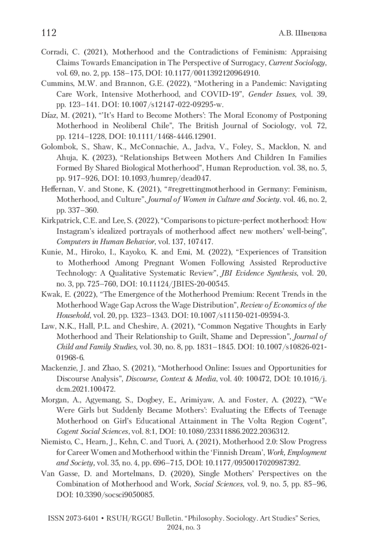 3. Cummins et al. 2022 - Cummins M.W., Brannon G.E. Mothering in a Pandemic: Navigating Care Work, Intensive Motherhood, and COVID-19 // Gender Issues. 2022. № 39. P. 123-141. https://doi.org/10.1007/s12147-022-09295-w.