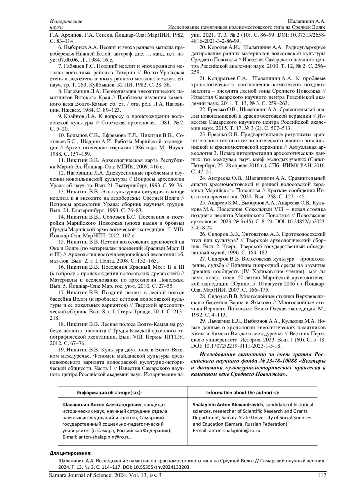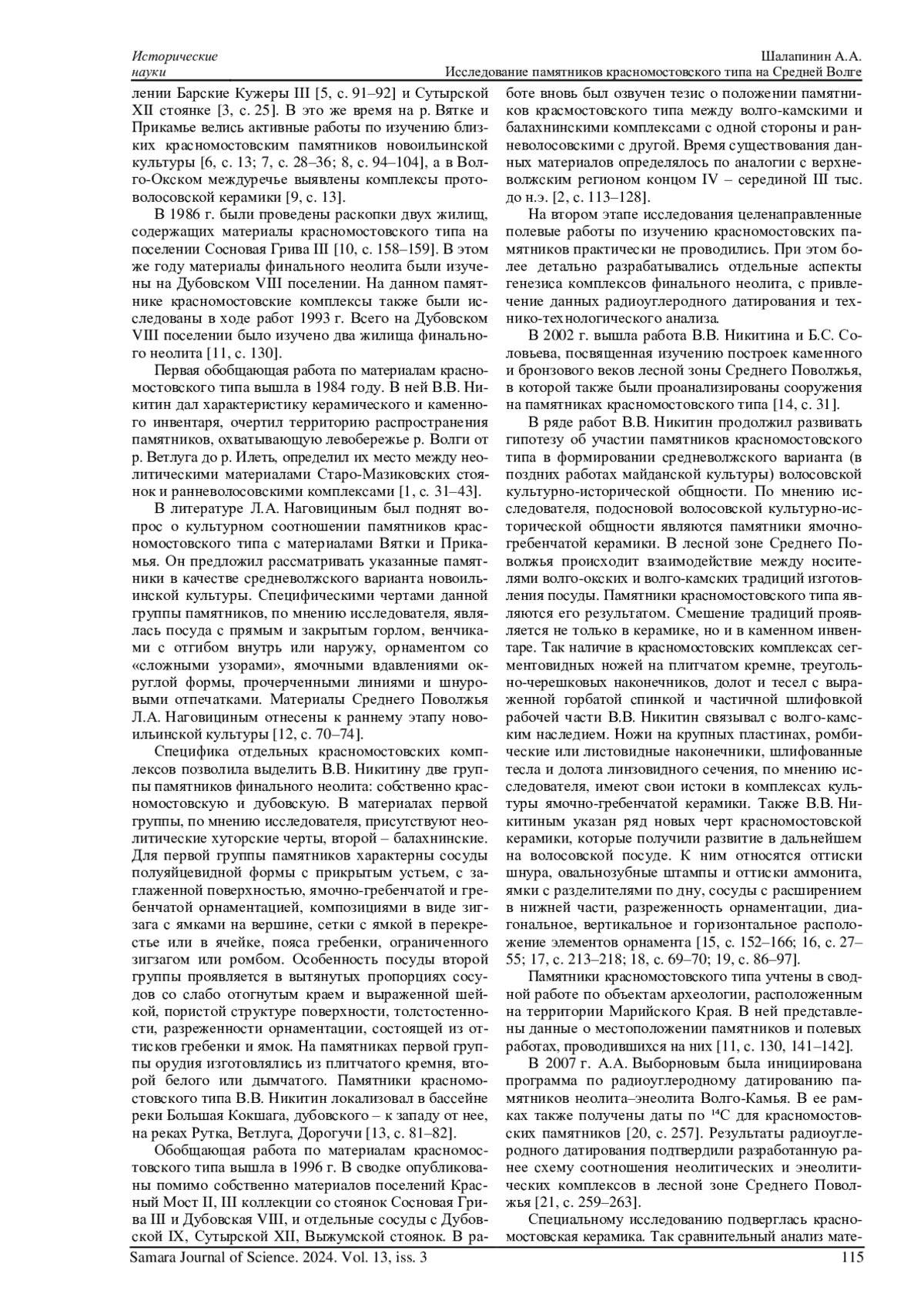 21. Кондратьев С.А., Шалапинин А.А. К проблеме хронологического соотношения комплексов позднего неолита - энеолита лесной зоны Среднего Поволжья // Известия Самарского научного центра Российской академии наук. 2011. Т. 13, № 3. С. 259-263. EDN: NXKHJH