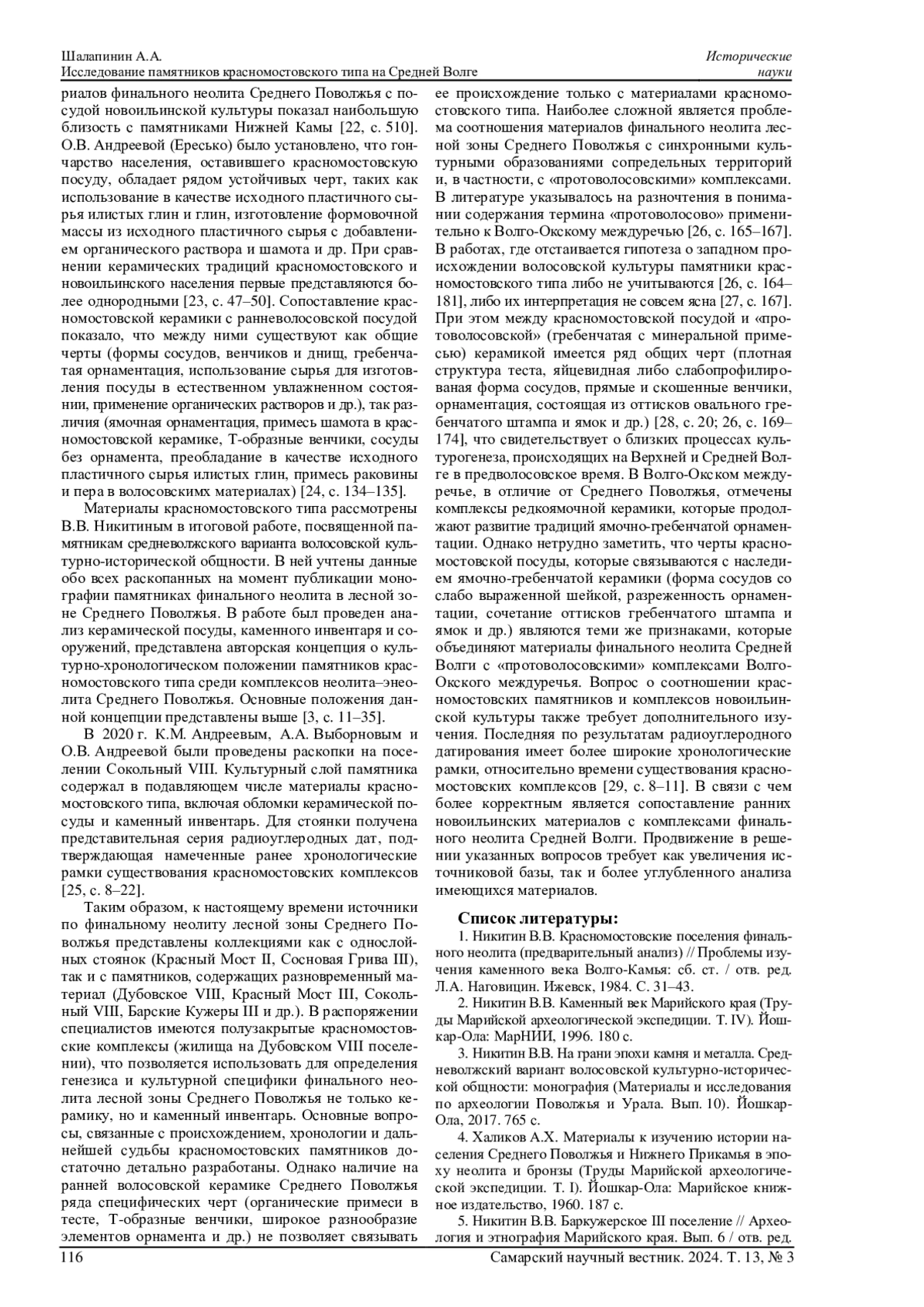 24. Андреева О.В., Шалапинин А.А. Сравнительный анализ красномостовской и ранней волосовской керамики Марийского Поволжья // Краткие сообщения Института археологии. 2022. Вып. 268. С. 127-145. EDN: WNSIBF
