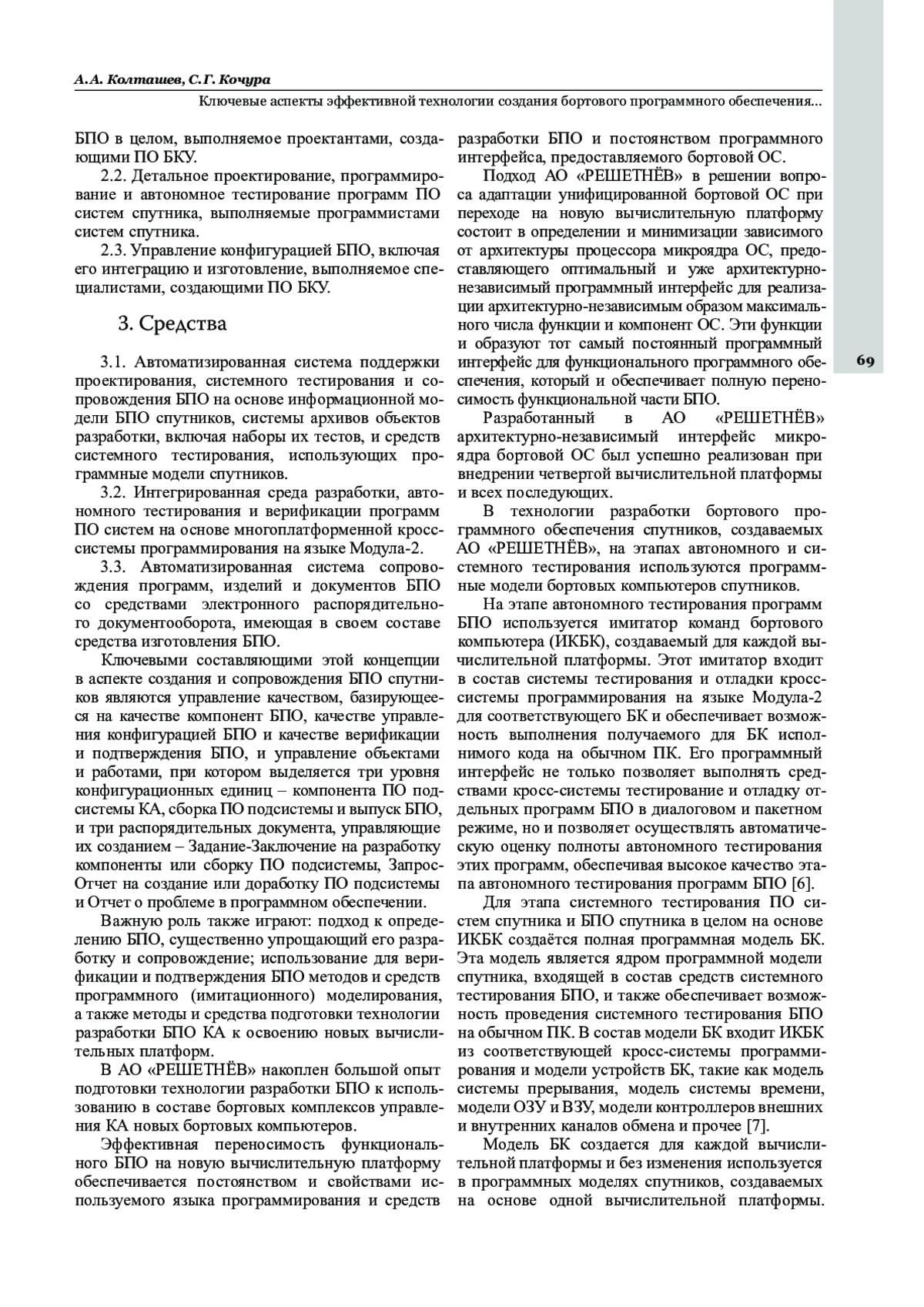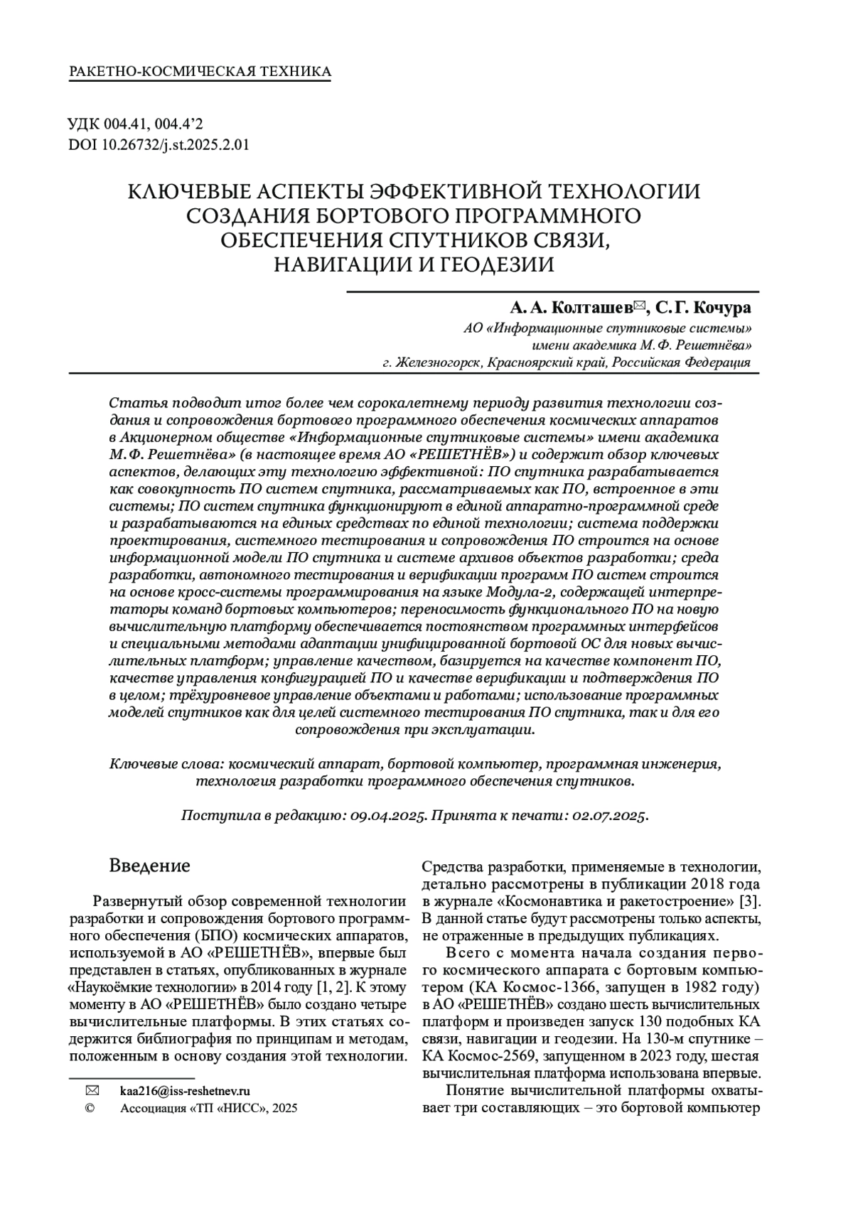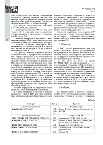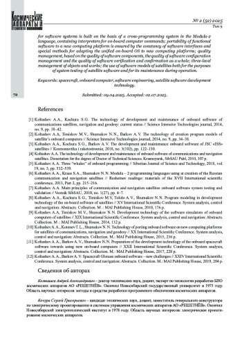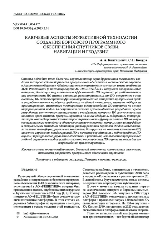Статья подводит итог более чем сорокалетнему периоду развития технологии создания и сопровождения бортового программного обеспечения космических аппаратов в Акционерном обществе «Информационные спутниковые системы» имени академика М. Ф. Решетнёва» (в настоящее время АО «РЕШЕТНЁВ») и содержит обзор ключевых аспектов, делающих эту технологию эффективной: ПО спутника разрабатывается как совокупность ПО систем спутника, рассматриваемых как ПО, встроенное в эти системы; ПО систем спутника функционируют в единой аппаратно-программной среде и разрабатываются на единых средствах по единой технологии; система поддержки проектирования, системного тестирования и сопровождения ПО строится на основе информационной модели ПО спутника и системе архивов объектов разработки; среда разработки, автономного тестирования и верификации программ ПО систем строится на основе кросс-системы программирования на языке Модула‑2, содержащей интерпретаторы команд бортовых компьютеров; переносимость функционального ПО на новую вычислительную платформу обеспечивается постоянством программных интерфейсов и специальными методами адаптации унифицированной бортовой ОС для новых вычислительных платформ; управление качеством, базируется на качестве компонент ПО, качестве управления конфигурацией ПО и качестве верификации и подтверждения ПО в целом; трёхуровневое управление объектами и работами; использование программных моделей спутников как для целей системного тестирования ПО спутника, так и для его сопровождения при эксплуатации.