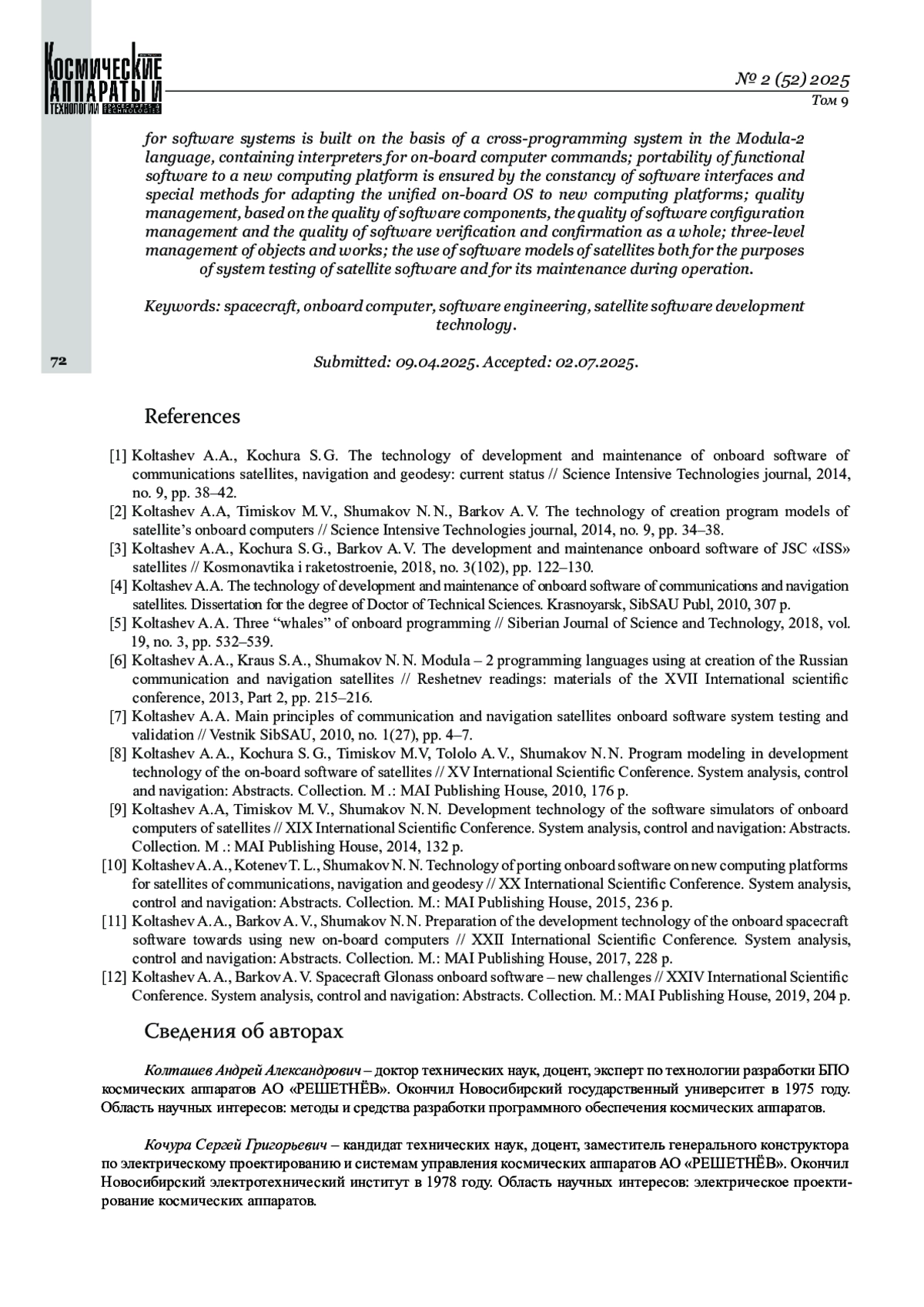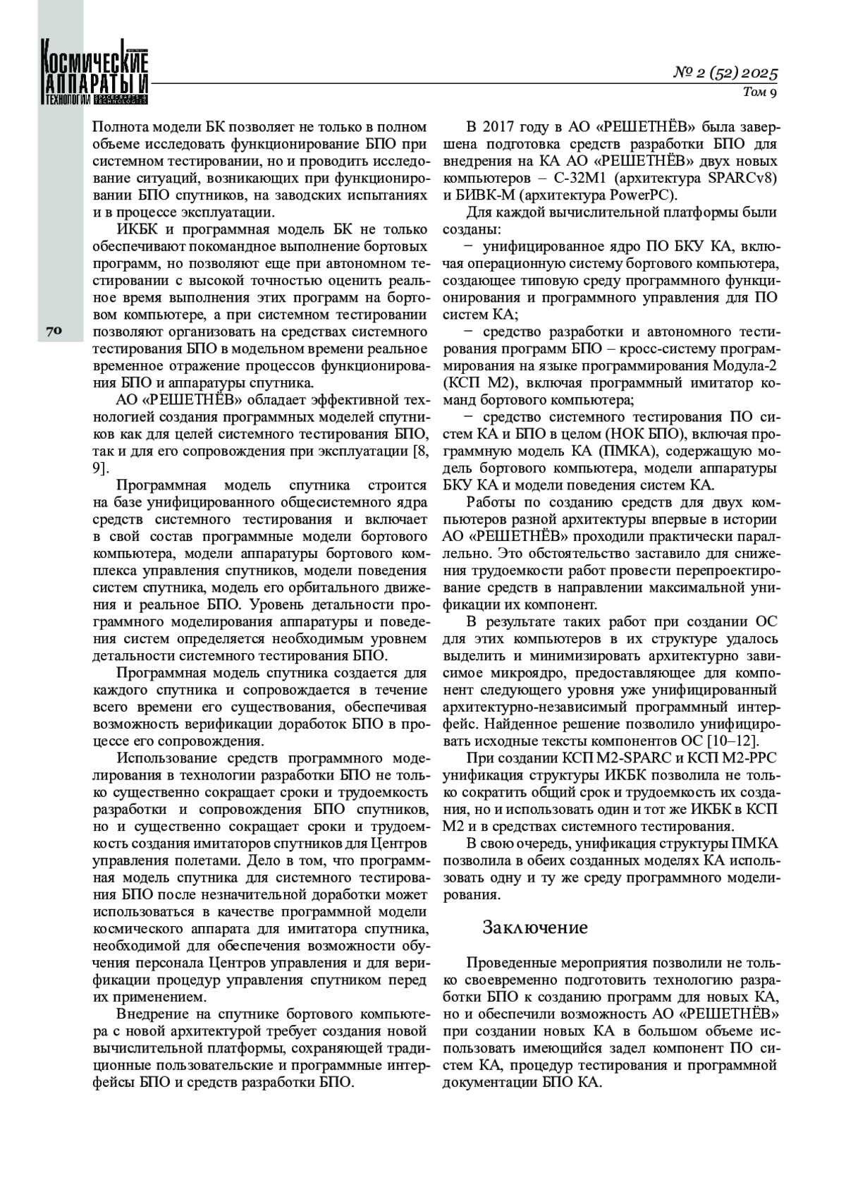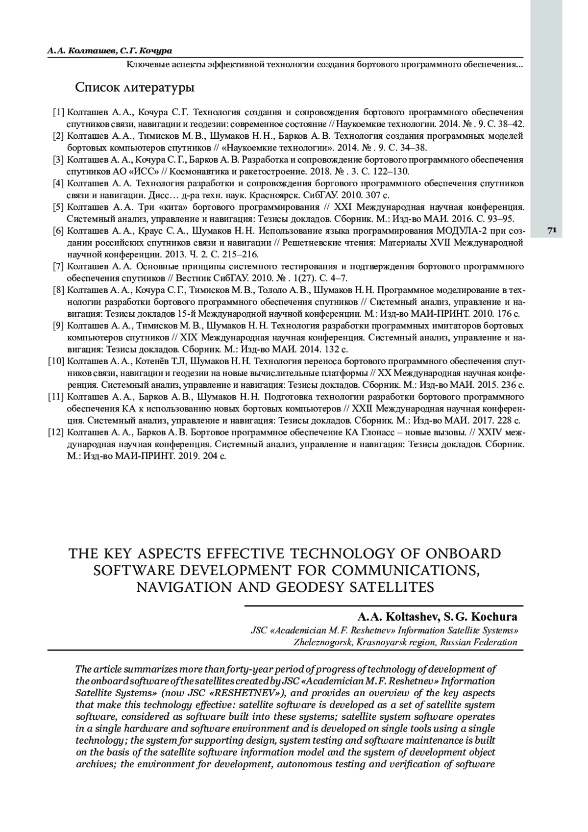 Статья подводит итог более чем сорокалетнему периоду развития технологии создания и сопровождения бортового программного обеспечения космических аппаратов в Акционерном обществе «Информационные спутниковые системы» имени академика М. Ф. Решетнёва» (в настоящее время АО «РЕШЕТНЁВ») и содержит обзор ключевых аспектов, делающих эту технологию эффективной: ПО спутника разрабатывается как совокупность ПО систем спутника, рассматриваемых как ПО, встроенное в эти системы; ПО систем спутника функционируют в единой аппаратно-программной среде и разрабатываются на единых средствах по единой технологии; система поддержки проектирования, системного тестирования и сопровождения ПО строится на основе информационной модели ПО спутника и системе архивов объектов разработки; среда разработки, автономного тестирования и верификации программ ПО систем строится на основе кросс-системы программирования на языке Модула‑2, содержащей интерпретаторы команд бортовых компьютеров; переносимость функционального ПО на новую вычислительную платформу обеспечивается постоянством программных интерфейсов и специальными методами адаптации унифицированной бортовой ОС для новых вычислительных платформ; управление качеством, базируется на качестве компонент ПО, качестве управления конфигурацией ПО и качестве верификации и подтверждения ПО в целом; трёхуровневое управление объектами и работами; использование программных моделей спутников как для целей системного тестирования ПО спутника, так и для его сопровождения при эксплуатации.