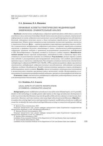 Введение: генетические модификации эмбрионов представляют собой одну из самых обсуждаемых тем, поскольку благодаря данной технологии возможно изменить генетическую информацию на этапе эмбрионального развития с целью предотвращения наследственных болезней, повышения качества жизни и даже улучшения определенных человеческих характеристик. Однако такие вмешательства вызывают множество правовых, этических и социальных дилемм. Цель - проанализировать существующие правовые нормы и подходы к генетическим модификациям эмбрионов в различных странах; определить основные этические и правовые дилеммы, возникающие в связи с генетическим редактированием эмбрионов; сравнить подходы к правовому регулированию генетических модификаций в США, Великобритании и Германии, выявив их сильные и слабые стороны. Методологическая основа: анализ научной литературы, законодательства и этических норм, качественные и количественные методы исследования. Результаты: разные страны имеют свои подходы к регулированию рассматриваемой технологии, что создает разнообразие правовых норм и этических стандартов. Рассмотрены основные технологии генетических модификаций эмбрионов (CRISPR-Cas9, TALENs, ZFNs), проанализированы сферы применения генетических модификаций эмбрионов (лечение наследственных заболеваний, улучшение здоровья, создание «дизайнерских» детей), а также основные принципы и нормы, касающиеся редактирования генов человека. Выводы: важно осознавать потенциальные негативные и положительные стороны применения таких технологий, чтобы сбалансировать их использование для развития репродуктивной медицины, прогресса в демографической области.
