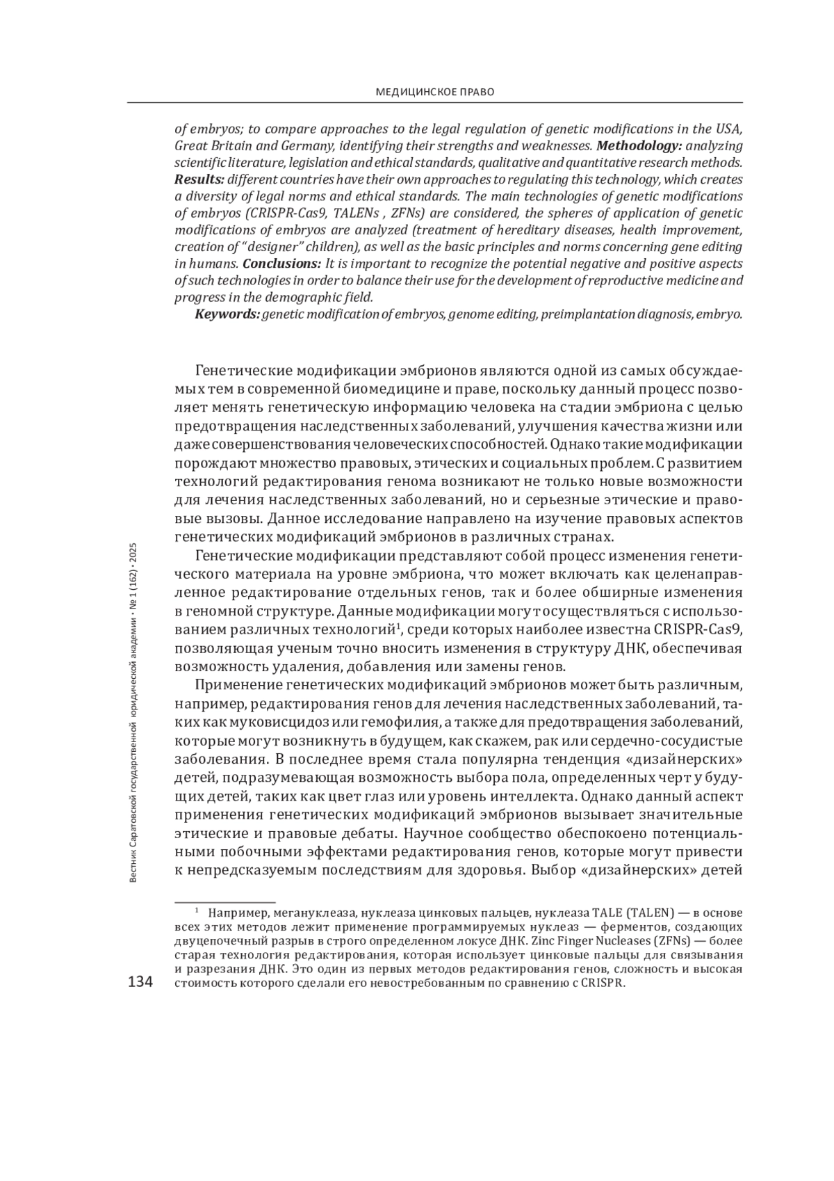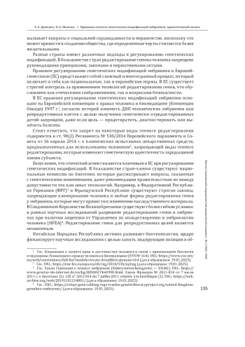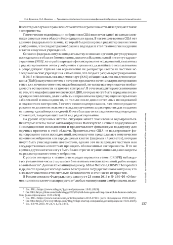 Генетические модификации эмбрионов являются одной из самых обсуждаемых тем в современной биомедицине и праве, поскольку данный процесс позволяет менять генетическую информацию человека на стадии эмбриона с целью предотвращения наследственных заболеваний, улучшения качества жизни или даже совершенствования человеческих способностей. Однако такие модификации порождают множество правовых, этических и социальных проблем. С развитием технологий редактирования генома возникают не только новые возможности для лечения наследственных заболеваний, но и серьезные этические и правовые вызовы. Данное исследование направлено на изучение правовых аспектов генетических модификаций эмбрионов в различных странах.