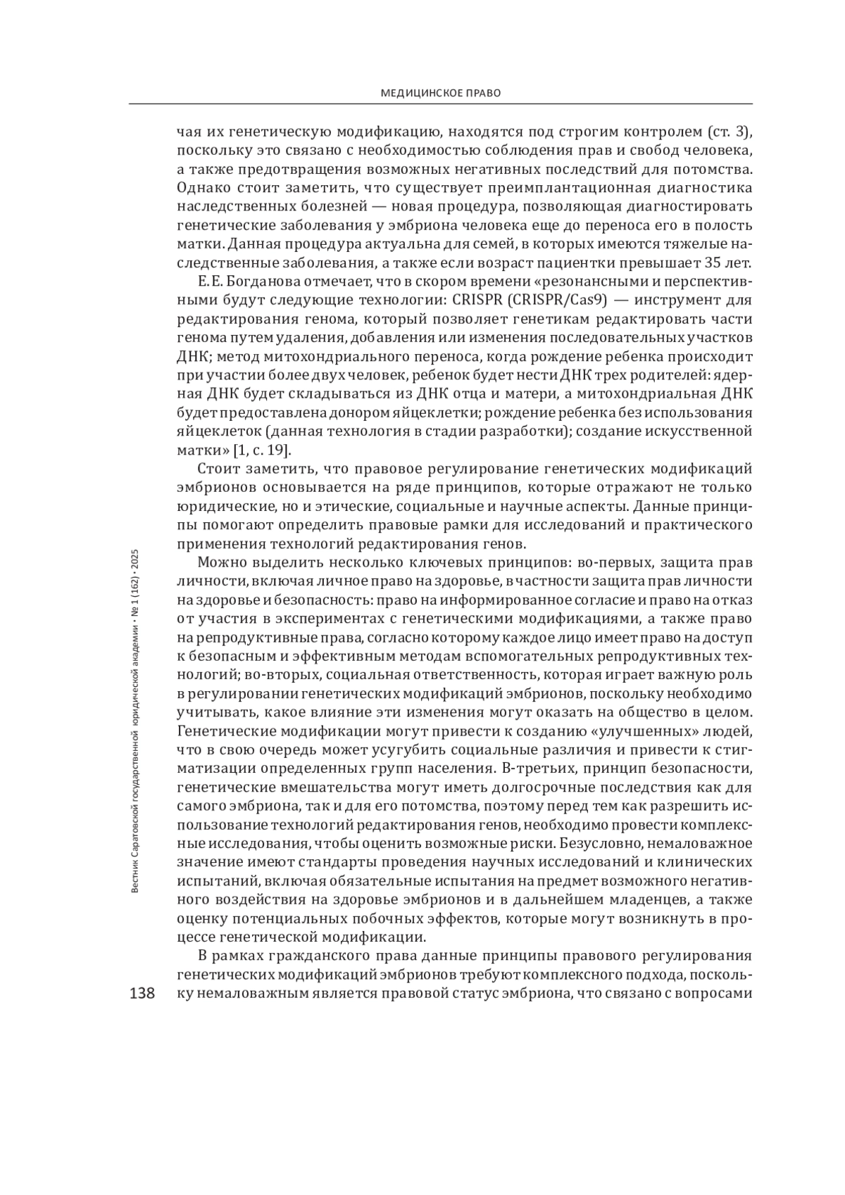 1. Богданова Е. Е. Правовые проблемы и риски генетической революции: генетическая информация и дискриминация // Lex Russica. 2019. № 6(151). С. 18-29. EDN: IFIEAK