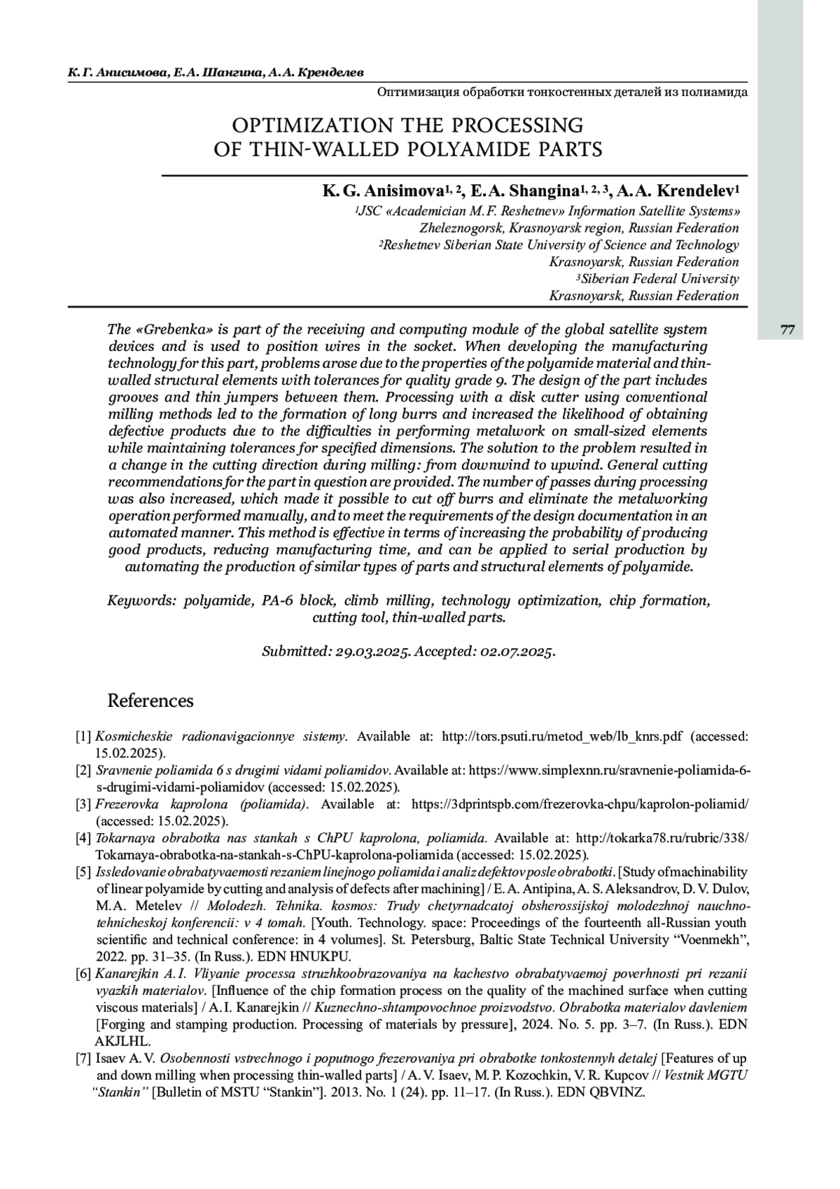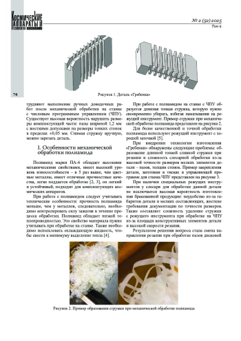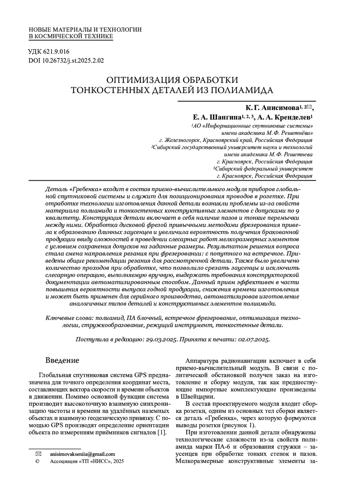 Деталь «Гребенка» входит в состав приемо-вычислительного модуля приборов глобальной спутниковой системы и служит для позиционирования проводов в розетке. При отработке технологии изготовления данной детали возникли проблемы из-за свойств материала полиамида и тонкостенных конструктивных элементов с допусками по 9 квалитету. Конструкция детали включает в себя наличие пазов и тонкие перемычки между ними. Обработка дисковой фрезой привычными методами фрезерования привела к образованию длинных заусенцев и увеличила вероятность получения бракованной продукции ввиду сложностей в проведении слесарных работ мелкоразмерных элементов с условием сохранения допусков на заданные размеры. Результатом решения вопроса стала смена направления резания при фрезеровании: с попутного на встречное. Приведены общие рекомендации резания для рассмотренной детали. Также было увеличено количество проходов при обработке, что позволило срезать заусенцы и исключить слесарную операцию, выполняемую вручную, выдержать требования конструкторской документации автоматизированным способом. Данный прием эффективен в части повышения вероятности выпуска годной продукции, снижения времени изготовления и может быть применен для серийного производства, автоматизировав изготовление аналогичных типов деталей и конструктивных элементов полиамида.