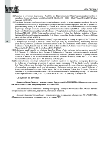 [5] Исследование обрабатываемости резанием линейного полиамида и анализ дефектов после обработки / Е. А. Антипина, А. С. Александров, Д. В. Дулов, М. А. Метелев // Молодежь. Техника. Космос: Труды четырнадцатой общероссийской молодежной научно-технической конференции: в 4 т., Санкт-Петербург, 23–27 мая 2022 года. Санкт-Петербург: