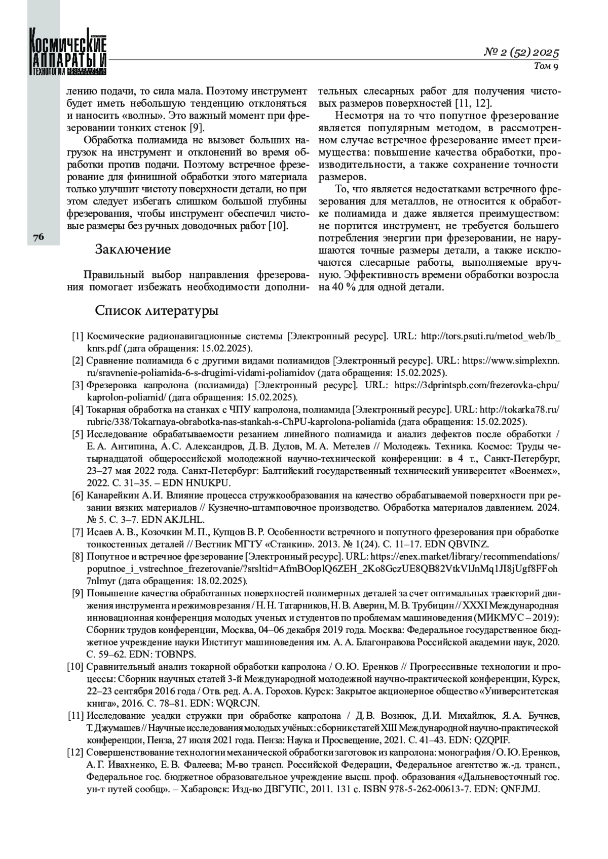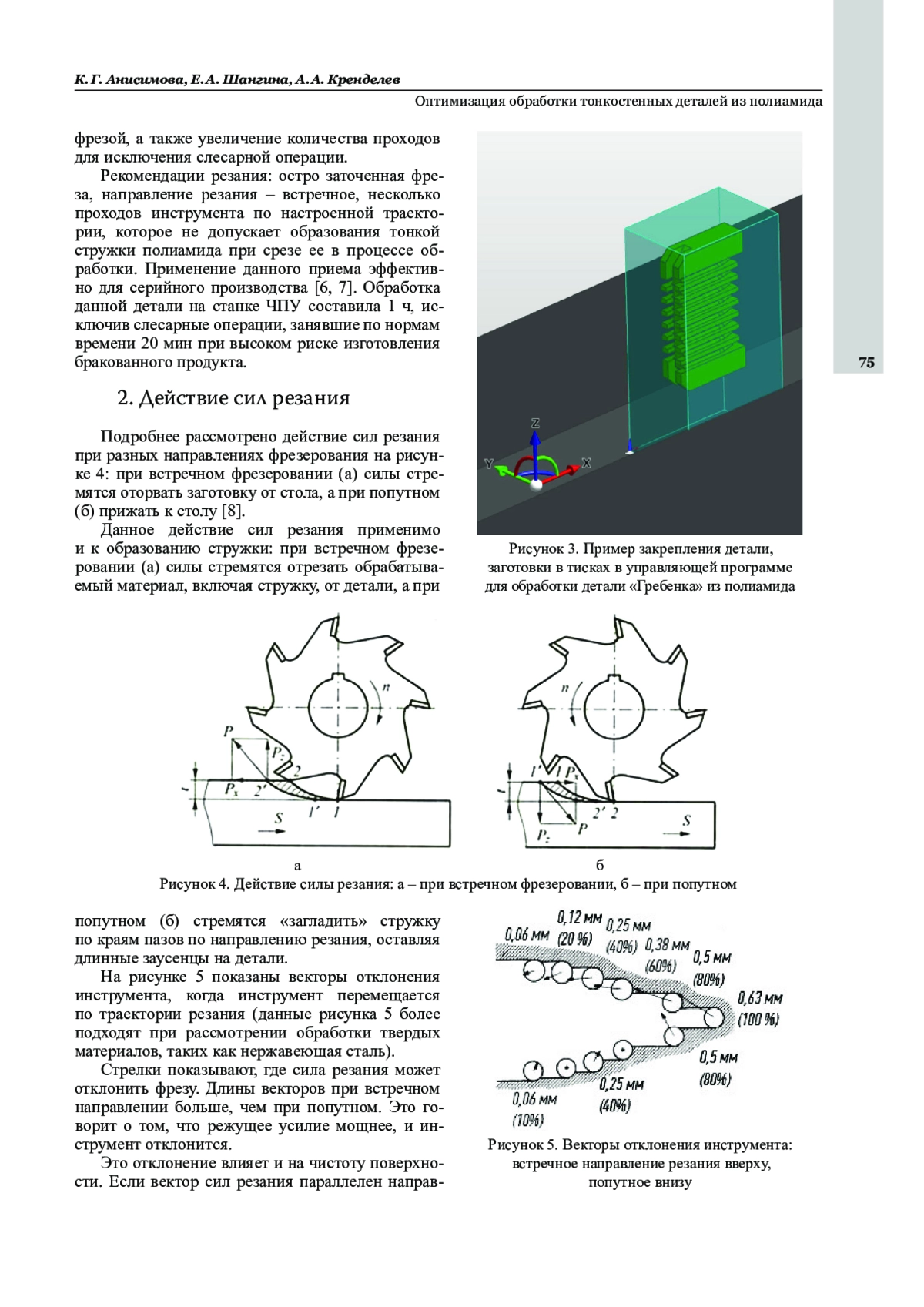 [7] Исаев А. В., Козочкин М. П., Купцов В. Р. Особенности встречного и попутного фрезерования при обработке тонкостенных деталей // Вестник МГТУ «Станкин». 2013. № 1(24). С. 11–17. EDN QBVINZ.