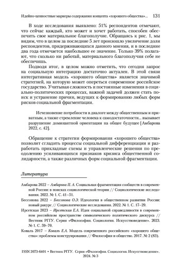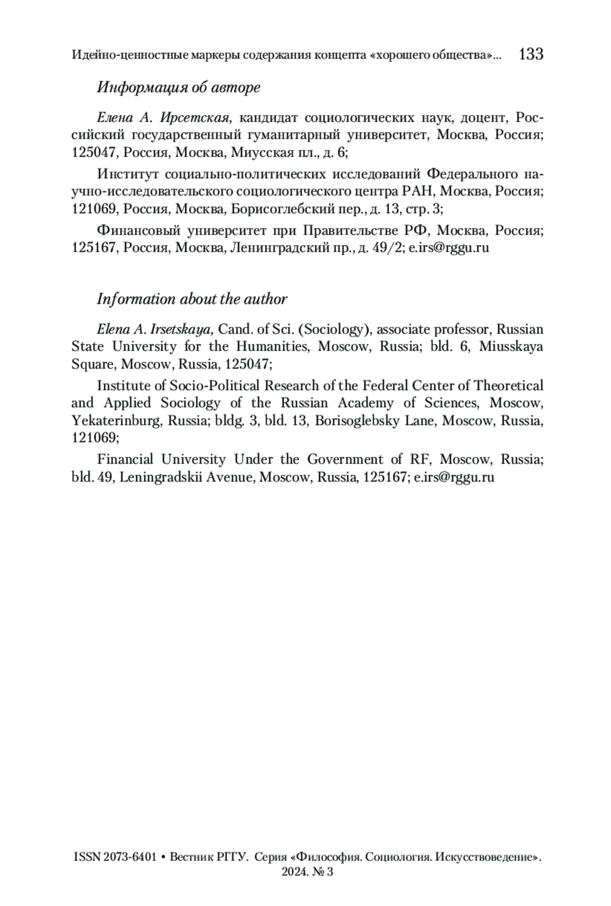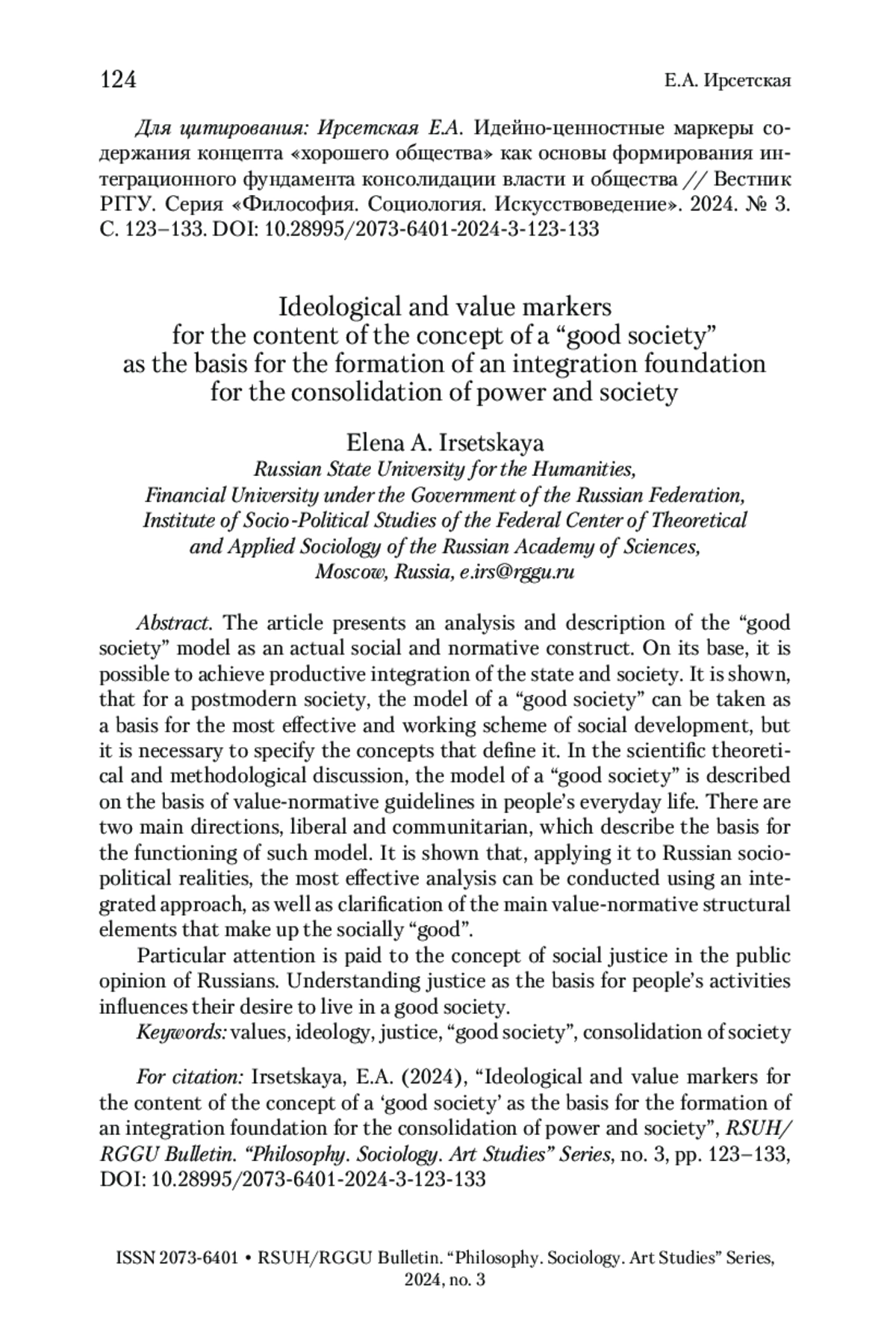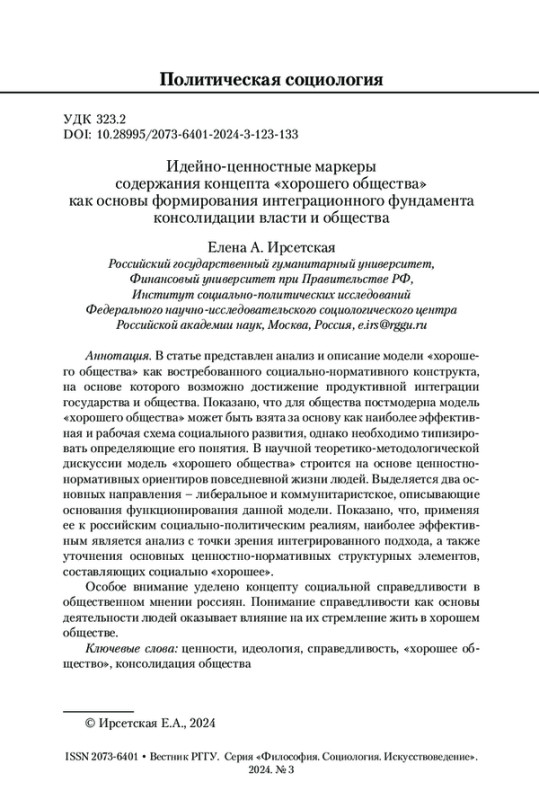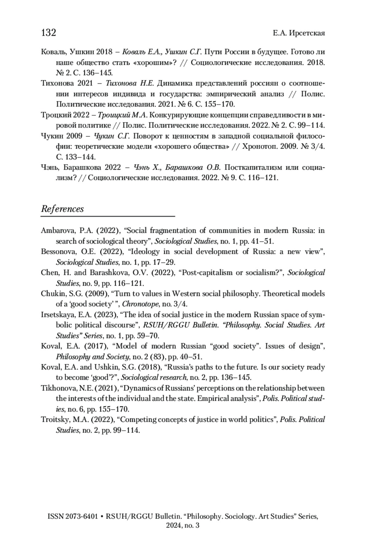 3. Ирсетская 2023 - Ирсетская Е.А. Идея социальной справедливости в современном российском пространстве символического политического дискурса // Вестник РГГУ. Серия «Философия. Социология. Искусствоведение». 2023. № 1. С. 59-70.