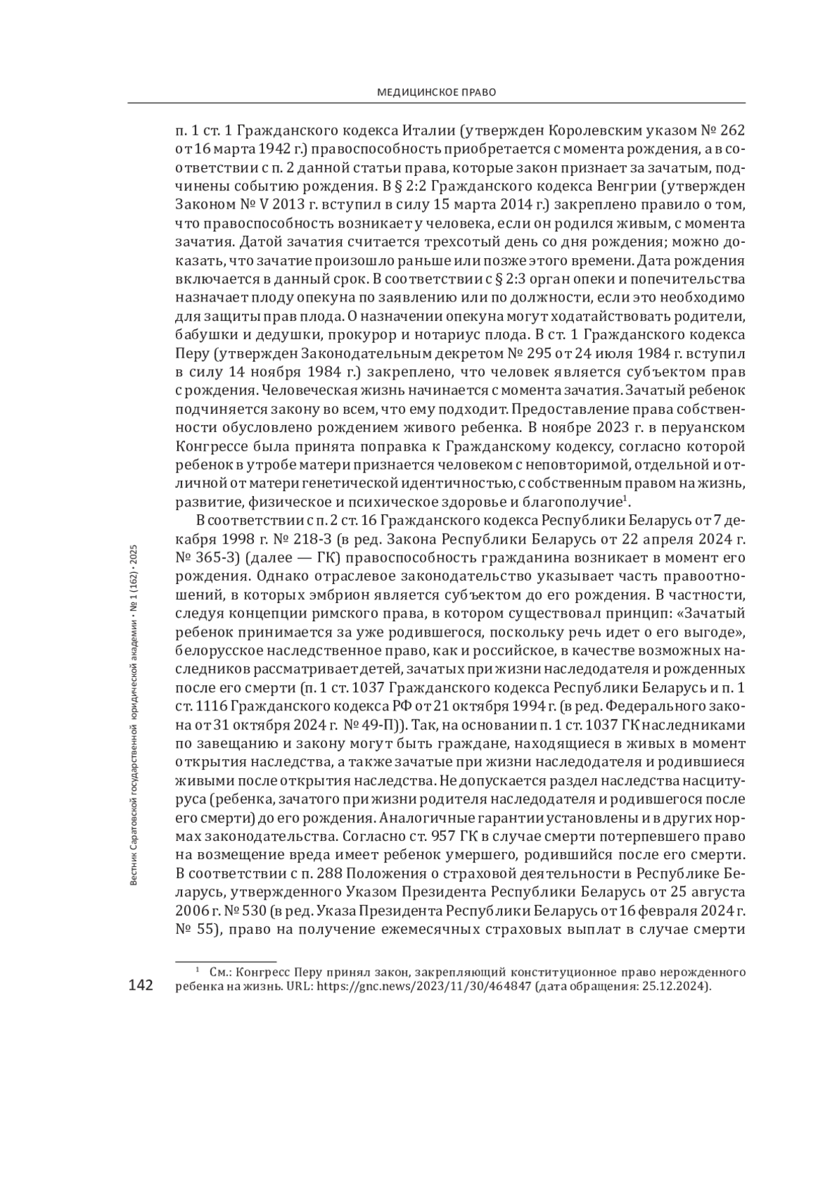 1. Жирикова К. А. Эмбрион человека: правовой режим или правовой статус? // Семейное и жилищное право. 2022. № 1. С. 3-6. EDN: QVEYGV
