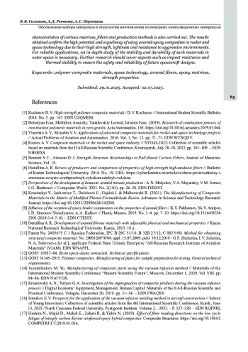 [4] Кустов А. В. Композиционные материалы в ракетно-космической отрасли // НТО-II‑2022: сборник научных статей по материалам II Всероссийской научной конференции, Красноярск, 28–30 июля 2022 года. С. 101–109. EDN NHSHXS.