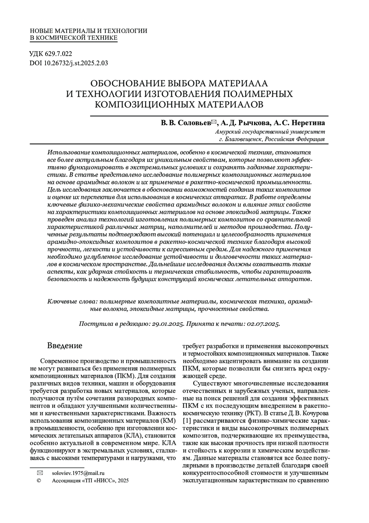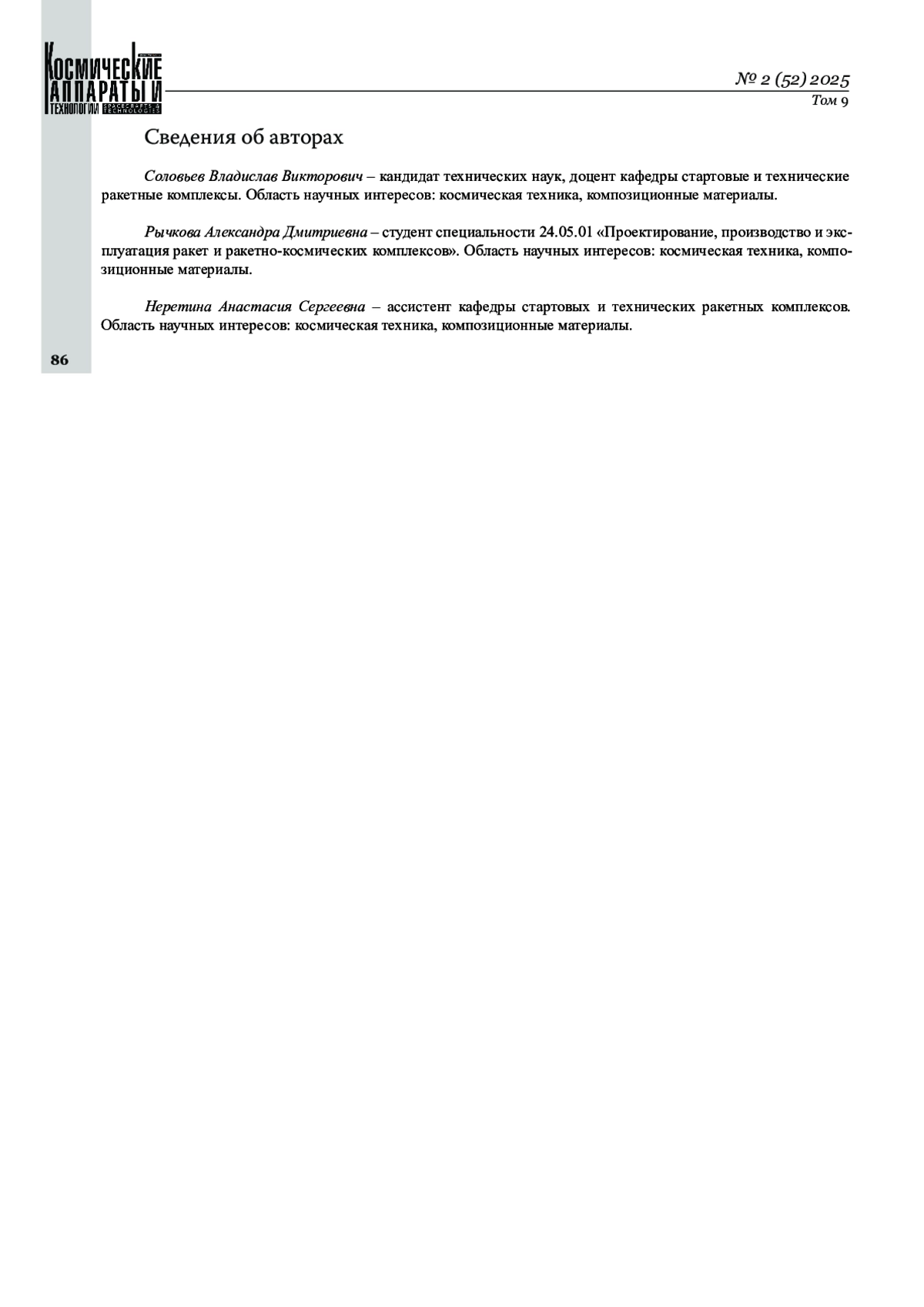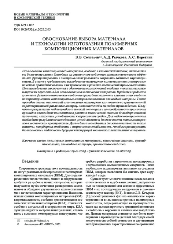 [3] Власенко А. В., Скрябин В. В. Применения перспективных композиционных материалов для проектов ракетно-космической техники // Актуальные проблемы авиации и космонавтики. 2016. Т. 1, № 12. С. 71–73. EDN WTNQDV.