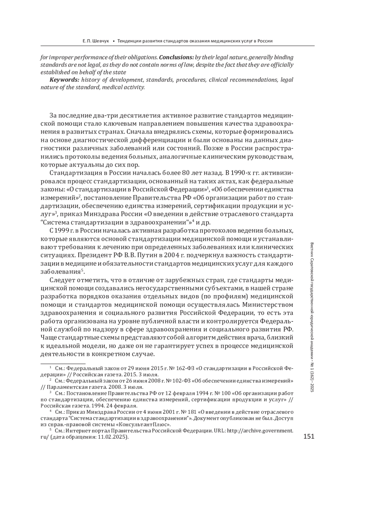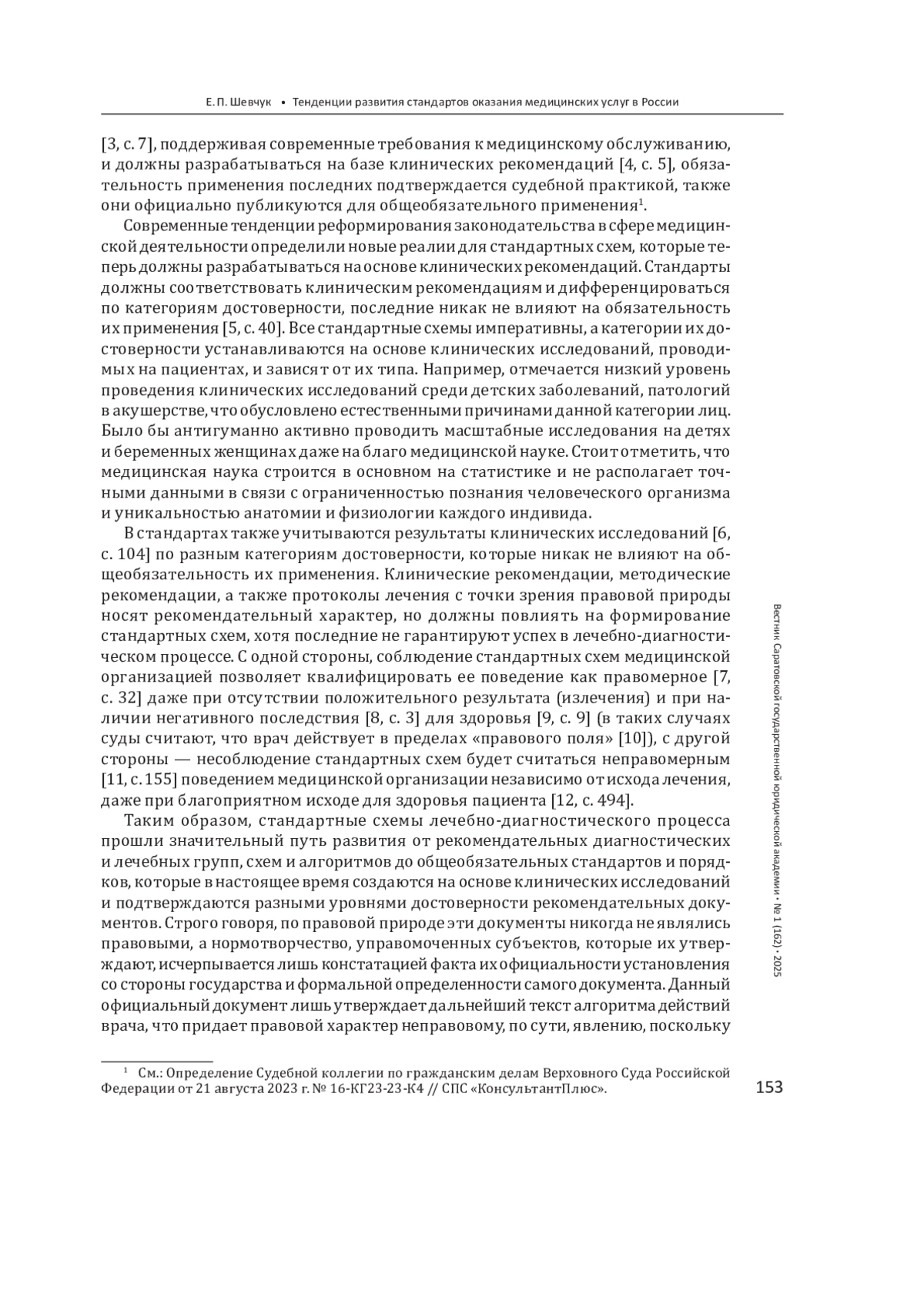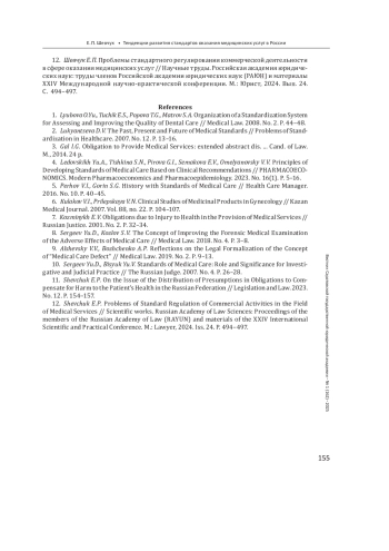 12. Шевчук Е. П. Проблемы стандартного регулирования коммерческой деятельности в сфере оказания медицинских услуг // Научные труды. Российская академия юридических наук: труды членов Российской академии юридических наук (РАЮН) и материалы XXIV Международной научно-практической конференции. М.: Юрист, 2024. Вып. 24. С. 494-497. EDN: KPPXNB