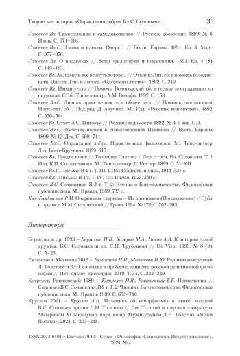 2. Евлампиев, Матвеева 2019 - Евлампиев И.И., Матвеева И.Ю. Религиозные учения Л. Толстого и Вл. Соловьева и проблема единства русской религиозной философии // Ист.-филос. ежегодник. 2019. Т. 34. С. 222-249.