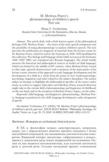 Статья посвящена малоизвестному аспекту философского наследия М. Мерло-Понти – проблематике раннего речевого онтогенеза и возможности применения феноменологии для анализа детской речи. Данный текст предваряет публикацию фрагмента материалов лекционного курса М. Мерло-Понти, который он читал в Сорбонне в 1949–1952 гг. (опубликованы в сборнике «Психология и педагогика ребенка. Лекции в Сорбонне 1949–1952 гг.» 2001 г., не переводились на русский язык). В статье кратко представлены исторический и философский контекст исследований детской речи, который сложился к середине XX в., когда Мерло-Понти обратился к этой теме, общие характеристики и краткое изложение основных моментов данного курса, особенности его подхода к раннему речевому развитию и развитию ребенка в целом с точки зрения феноменологии, психологии, лингвистики и смежных дисциплин, интересующихся данной тематикой. Автор предпринимает попытку выделить философскую специфику исследуемого источника, а также предположить, какое место это исследовательское направление Мерло-Понти может занять в актуальном поле феноменологии и лингвистики детства, с одной стороны, и в рецепции наследия Мерло-Понти – с другой.
