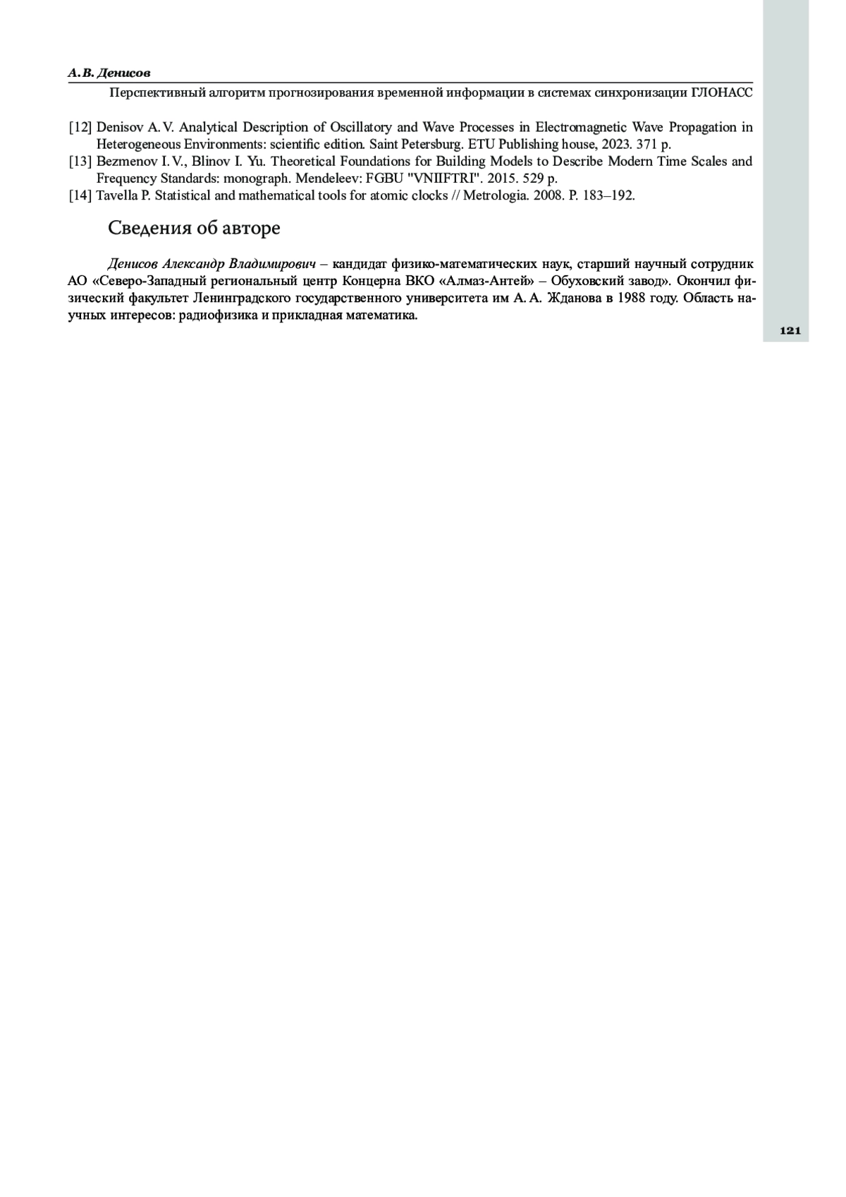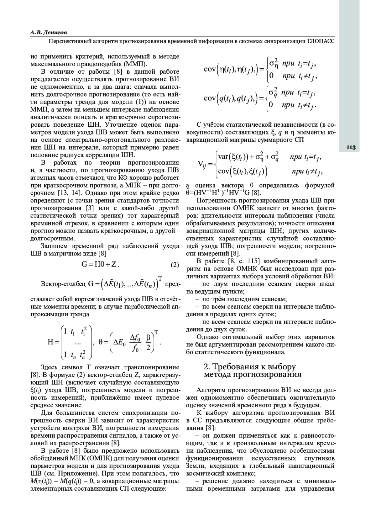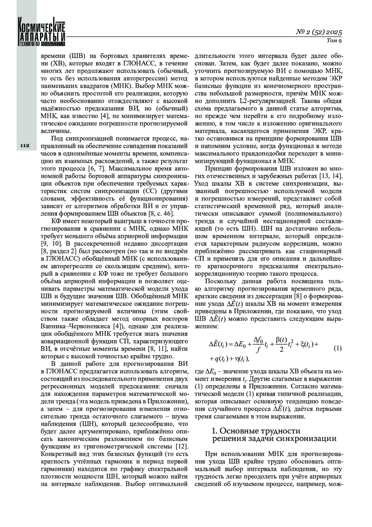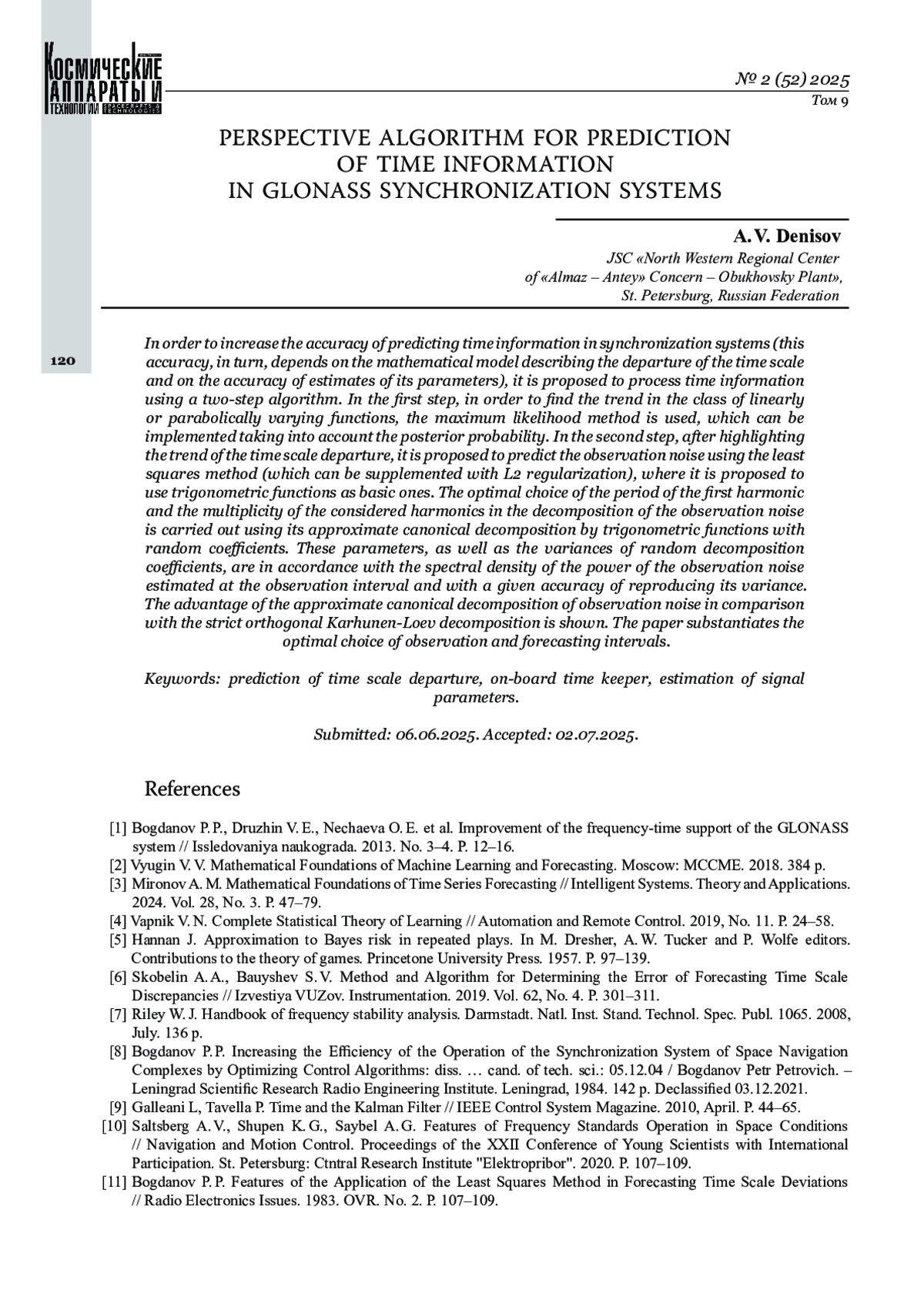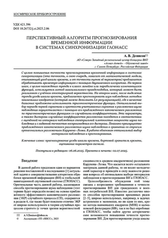 С целью повышения точности прогнозирования временной информации в системах синхронизации (эта точность, в свою очередь, зависит от математической модели, описывающей уход шкалы времени, и от точности оценок её параметров) предлагается обрабатывать временную информацию с помощью двухшагового алгоритма. На первом шаге, с целью нахождения тренда в классе линейно или параболически изменяющихся функций, используется метод максимального правдоподобия, который может быть реализован с учётом апостериорной вероятности. На втором шаге, после выделения тренда ухода шкалы времени, предлагается прогнозировать шум наблюдения методом наименьших квадратов (который можно дополнить L2-регуляризацией), где в качестве базисных предложено использовать тригонометрические функции. Оптимальный выбор периода первой гармоники и кратности учитываемых гармоник в разложении шума наблюдения осуществляется с помощью его приближённого канонического разложения по тригонометрическим функциям со случайными коэффициентами. Эти параметры, а также дисперсии случайных коэффициентов разложения находятся в соответствии с оценённой на интервале наблюдения спектральной плотностью мощности шума наблюдения и с заданной точностью воспроизведения его дисперсии. Показано преимущество приближённого канонического разложения шума наблюдения в сравнении со строгим ортогональным разложением Карунена–Лоэва. В работе обоснован оптимальный выбор интервалов наблюдения и прогнозирования.
