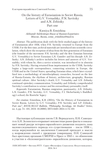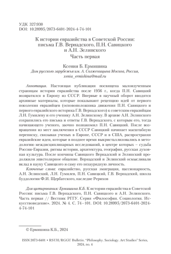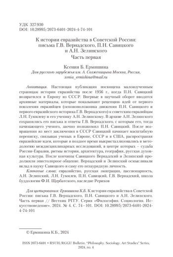 Настоящая публикация посвящена малоизученным страницам истории евразийства после 1956 г., когда П. Н. Савицкий возвратился в Европу из СССР. Впервые в научный оборот вводятся архивные материалы, которые показывают рецепцию идей от первого поколения евразийцев (основоположника движения П. Н. Савицкого и первого евразийского историка Г. В. Вернадского) к советским евразийцам Л. Н. Гумилеву и его ученику А. Н. Зелинскому. В архиве А. Н. Зелинского сохранились его письма и ответы Г. В. Вернадского, с которым его, тогда начинающего ученого, заочно познакомил П. Н. Савицкий. После возвращения из мест заключения в СССР Савицкий начинает масштабную переписку, связывая ученых в Европе, СССР и в США, распространяя евразийские идеи, которые в позднее время выкристаллизовались в методологию междисциплинарных исследований, в центре которых – судьба России-Евразии, ритмы истории, архитектура, география, русская духовная культура. После кончины Савицкого Вернадский и Зелинский продолжили эпистолярное общение. Вернадский и Зелинский осмысливали вклад в науку Савицкого и саму его незаурядную личность.