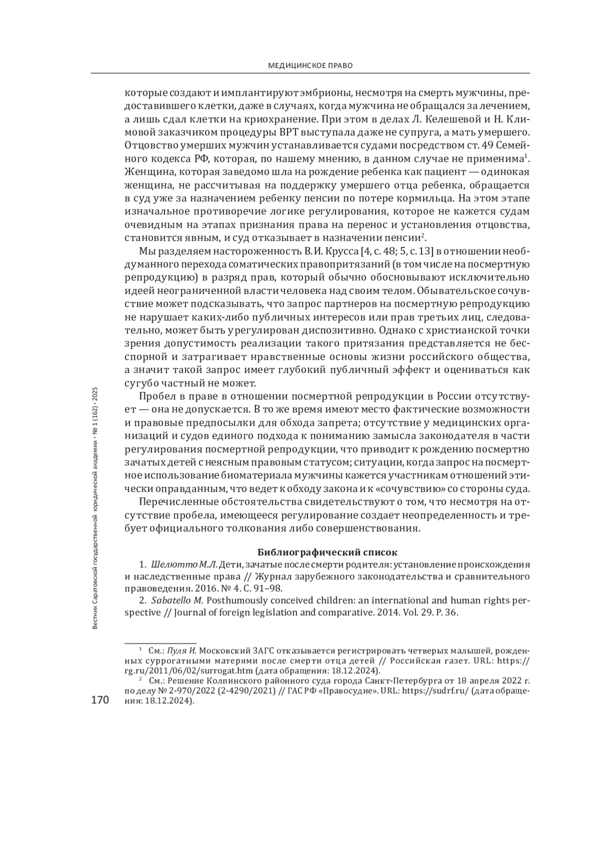 2. Sabatello M. Posthumously conceived children: an international and human rights perspective // Journal of foreign legislation and comparative. 2014. Vol. 29. Р. 36.