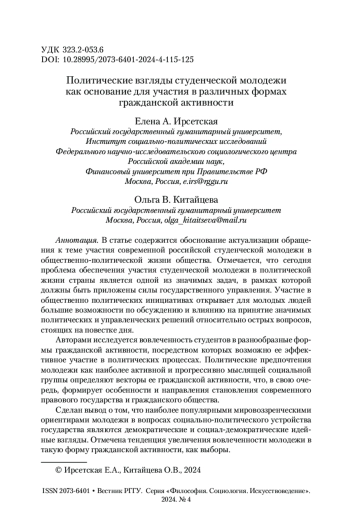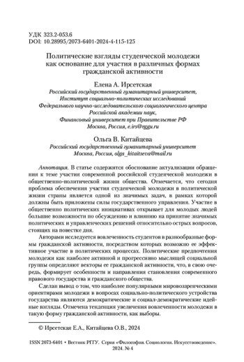 Авторами исследуется вовлеченность студентов в разнообразные формы гражданской активности, посредством которых возможно ее эффективное участие в политических процессах. Политические предпочтения молодежи как наиболее активной и прогрессивно мыслящей социальной группы определяют векторы ее гражданской активности, что, в свою очередь, формирует особенности и направления становления современного правового государства и гражданского общества.
