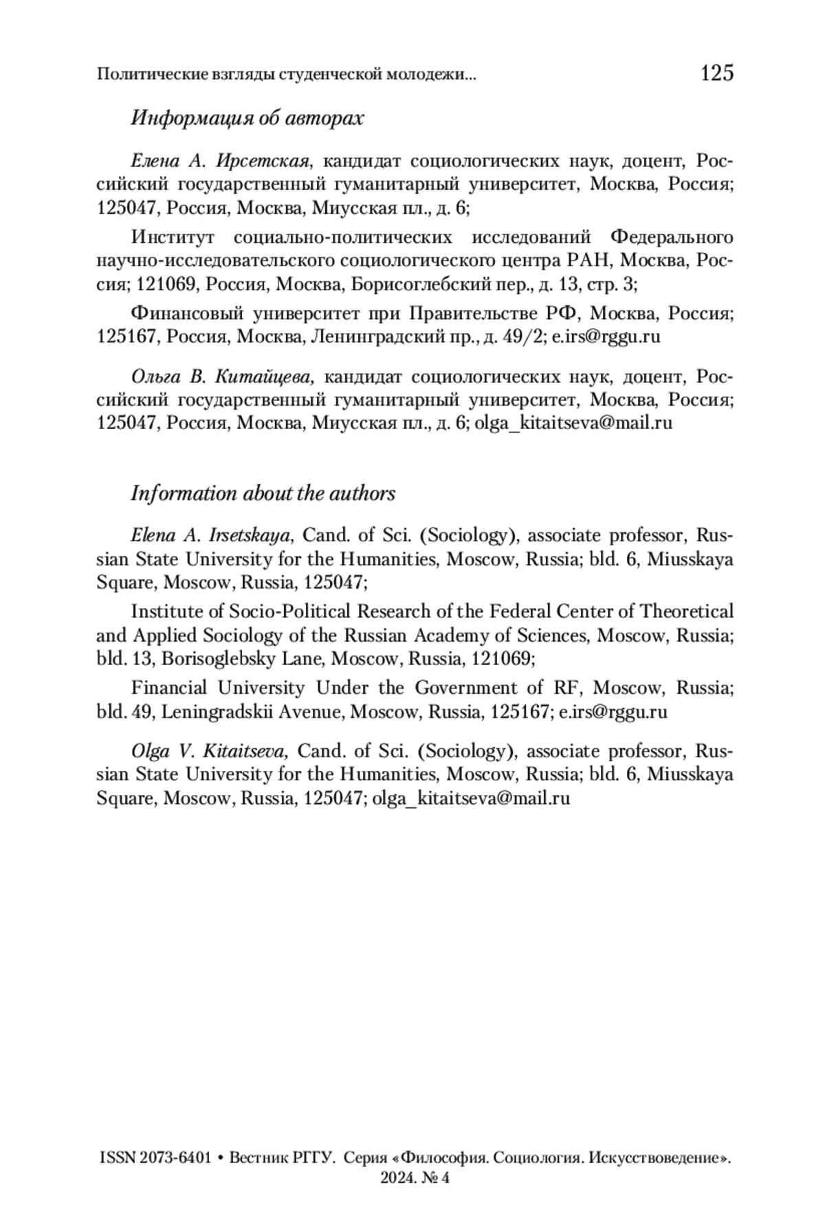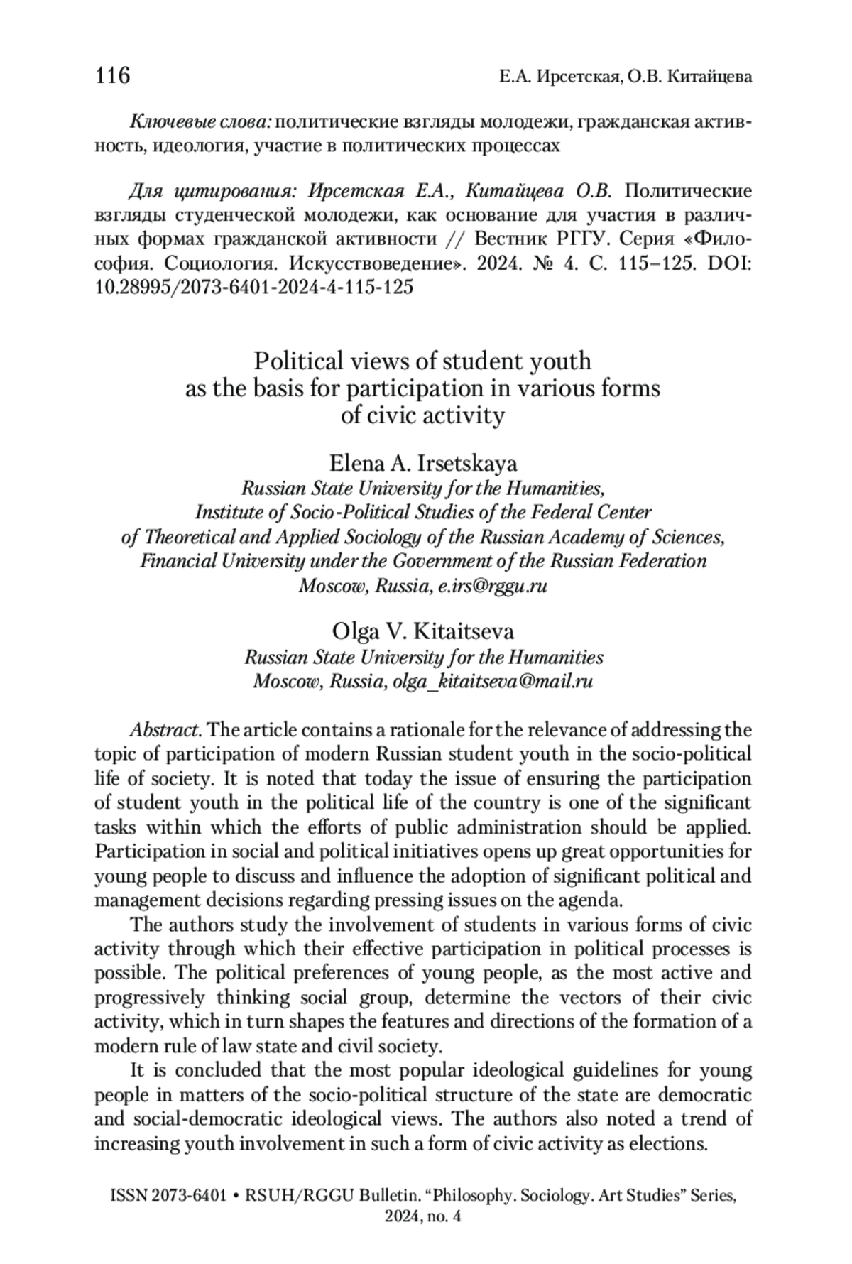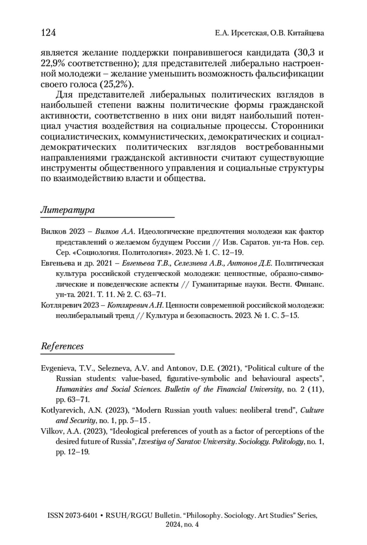 1. Вилков 2023 - Вилков А.А. Идеологические предпочтения молодежи как фактор представлений о желаемом будущем России // Изв. Саратов. ун-та Нов. сер. Сер. «Социология. Политология». 2023. № 1. С. 12-19.