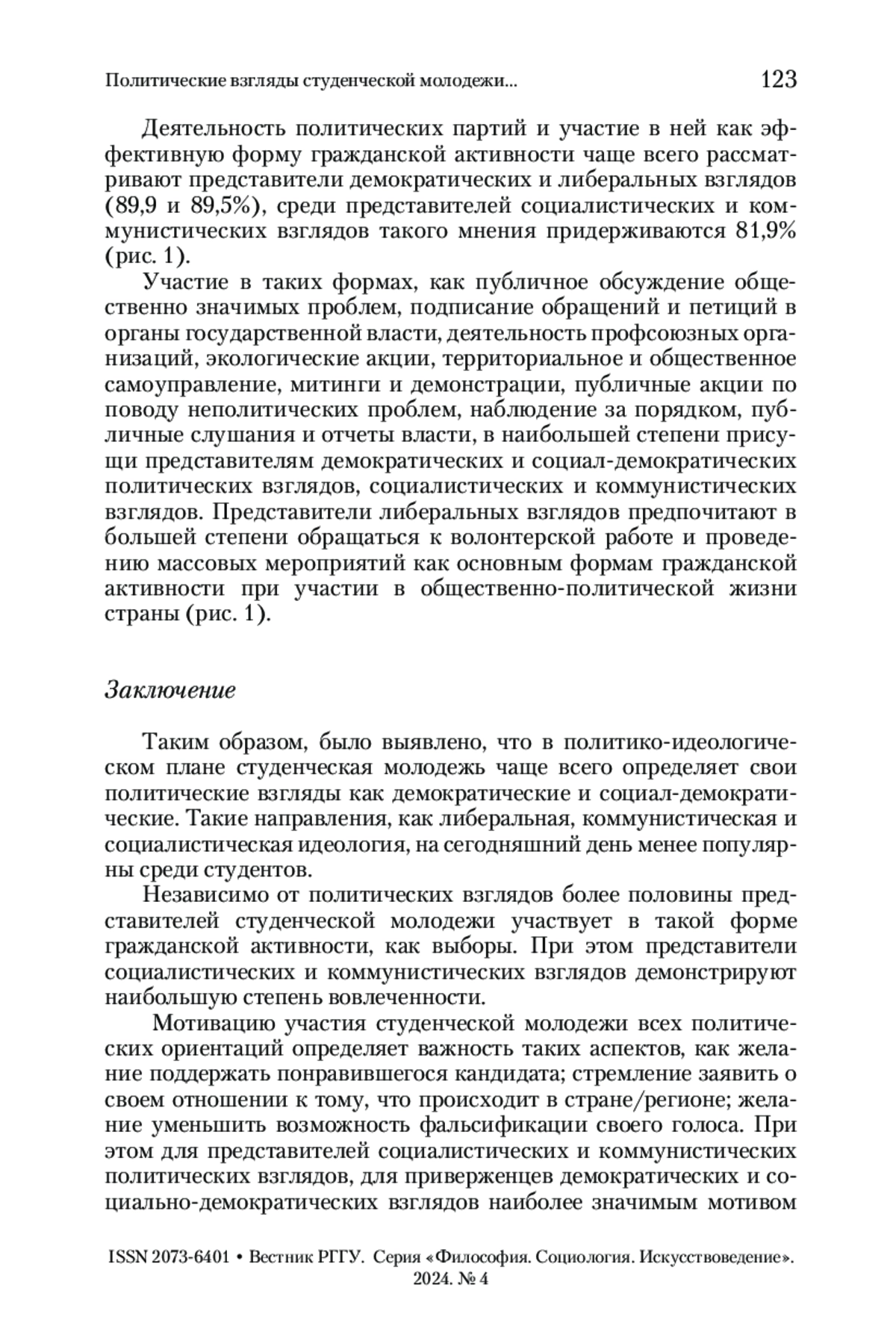 Сделан вывод о том, что наиболее популярными мировоззренческими ориентирами молодежи в вопросах социально-политического устройства государства являются демократические и социал-демократические идейные взгляды. Отмечена тенденция увеличения вовлеченности молодежи в такую форму гражданской активности, как выборы.