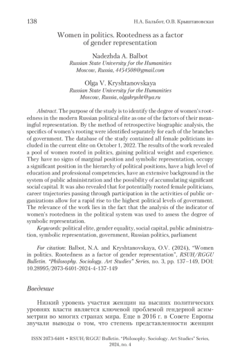 Целью данного исследования является выявление степени укорененности женщин в современной российской политической элите как одного из факторов их содержательного представительства. Методом ретроспективного биографического анализа были выделены особенности укоренения женщин отдельно для каждой из ветвей власти. База данных исследования содержала всех женщин-политиков, входящих в действующую элиту на 1 октября 2022 г. Выявлен пул укорененнных в политику женщин, набирающих политический вес и опыт. Они не имеют признаков маргинального положения и символического представительства, занимают значимое положение в иерархии политических должностей, обладают высоким уровнем образования и профессиональных компетенций, имеют обширный бэкграунд в системе государственного управления и возможности накопления весомого социального капитала. Также выявлено, что для потенциально укорененных женщин-политиков карьерные траектории, проходящие через участие в деятельности общественных организаций, позволяют осуществлять быстрый подъем на высшие политические уровни власти. Актуальность работы состоит в том, что анализ показателя укорененности женщин в политической системе был использован для оценки степени символического представительства.