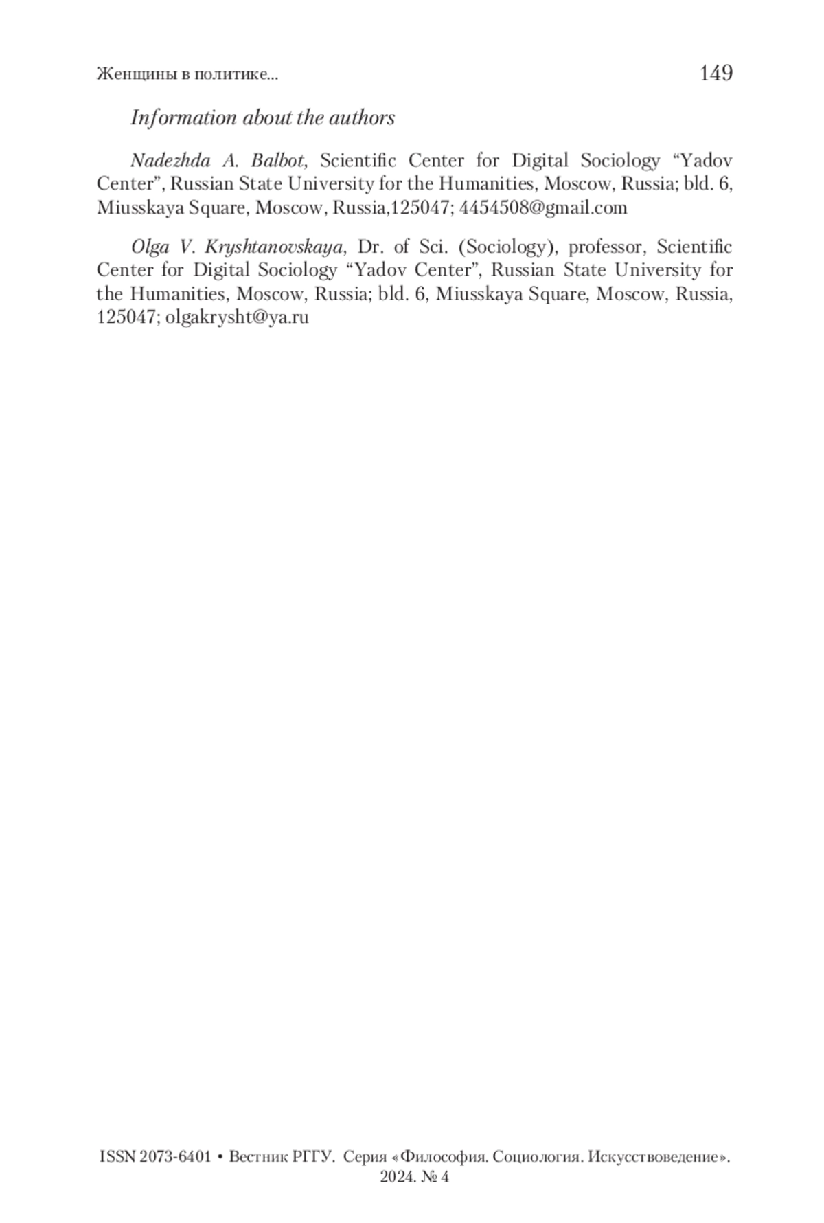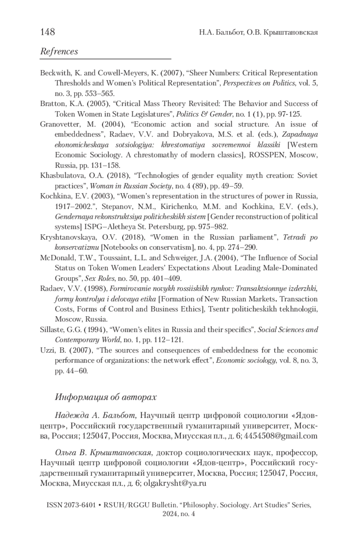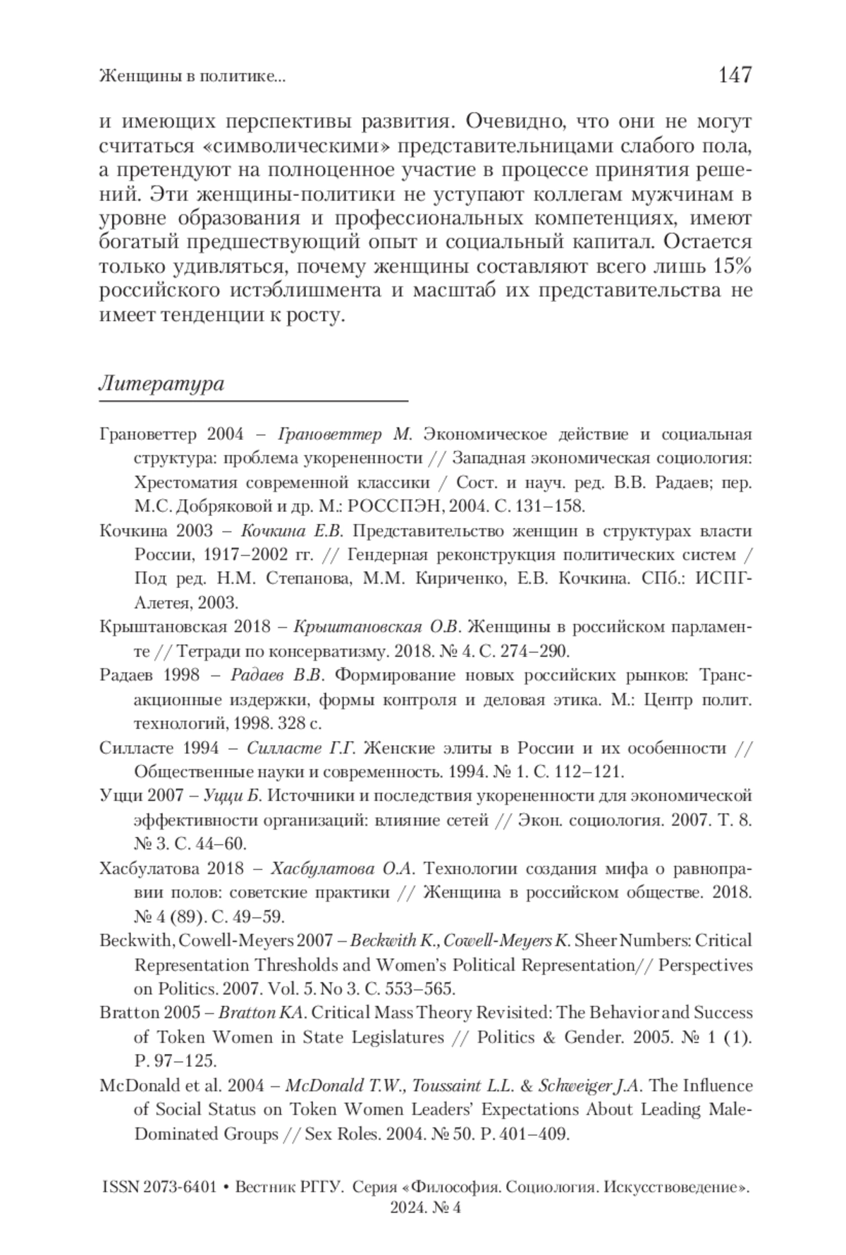 3. Крыштановская 2018 - Крыштановская О.В. Женщины в российском парламенте // Тетради по консерватизму. 2018. № 4. С. 274-290.