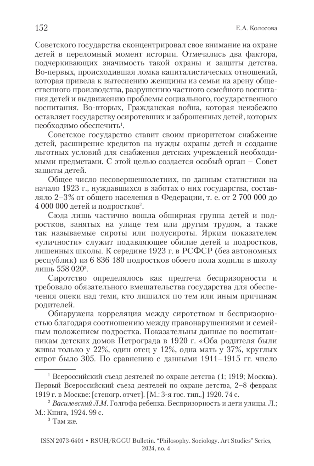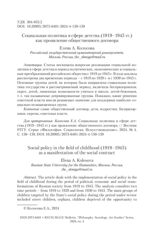 Статья посвящена вопросам реализации социальной политики в сфере детства в период политических, экономических и социальных преобразований российского общества с 1919 до 1945 г. В ходе анализа рассмотрены два временных периода – с 1919 по 1929 г. и с 1930 по 1945 г. Основные группы детей, на которых была направлена социальная политика государства в рассматриваемый период, включала беспризорников, сирот, детей, лишенных возможности учиться в школе, детей-беженцев, т. е. так называемые депривированные группы. Показано, какие решения советской власти имели решающее значение для поддержки наиболее социально незащищенных групп.