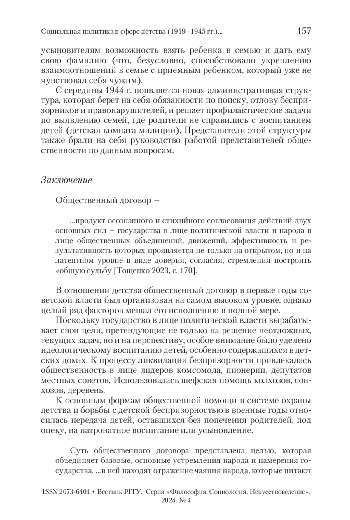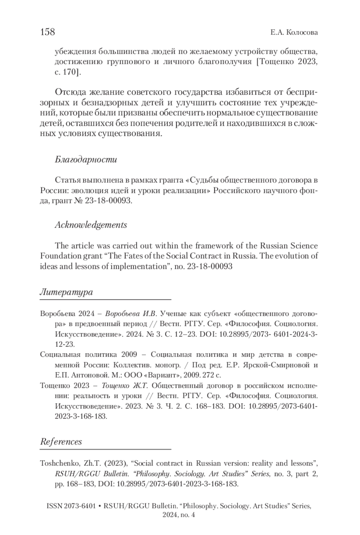 3. Тощенко 2023 - Тощенко Ж.Т. Общественный договор в российском исполнении: реальность и уроки // Вестн. РГГУ. Сер. «Философия. Социология. Искусствоведение». 2023. № 3. Ч. 2. С. 168-183. https://doi.org/10.28995/2073-6401-2023-3-168-183.
