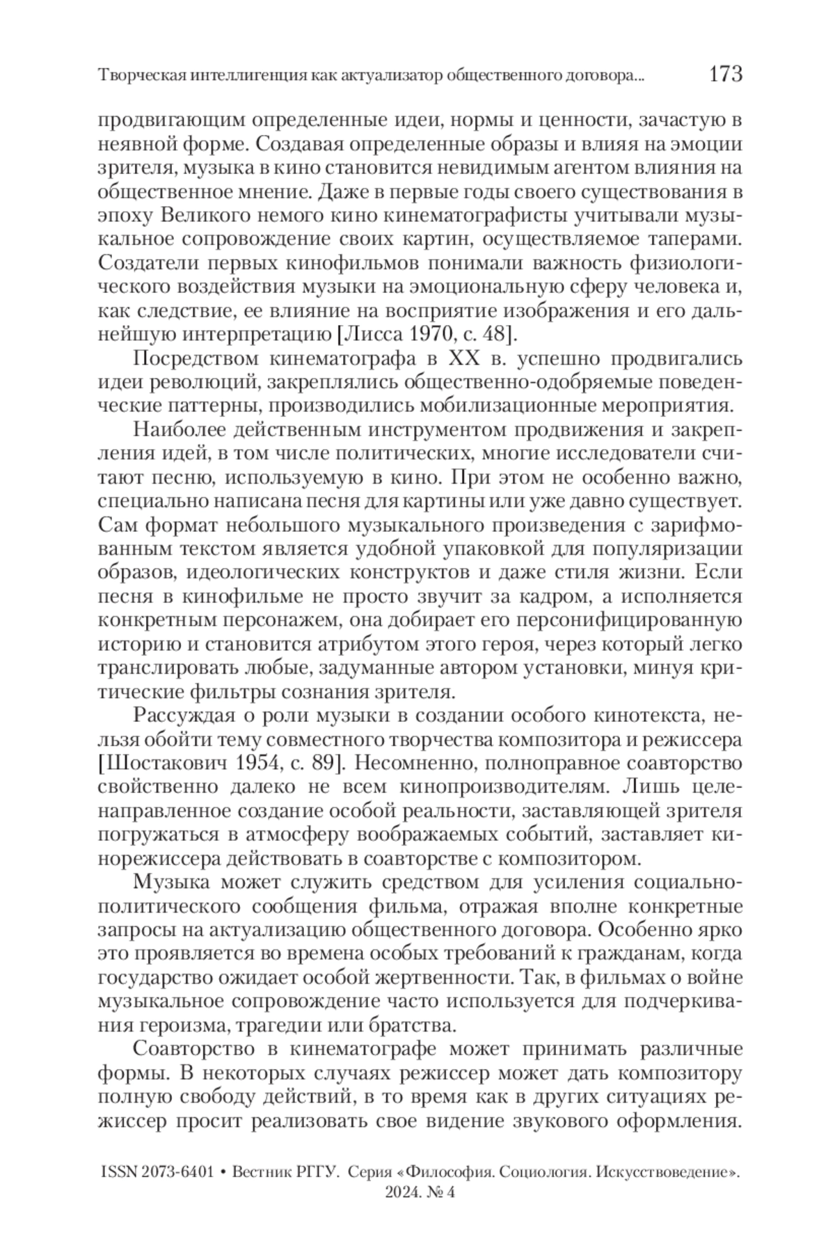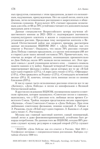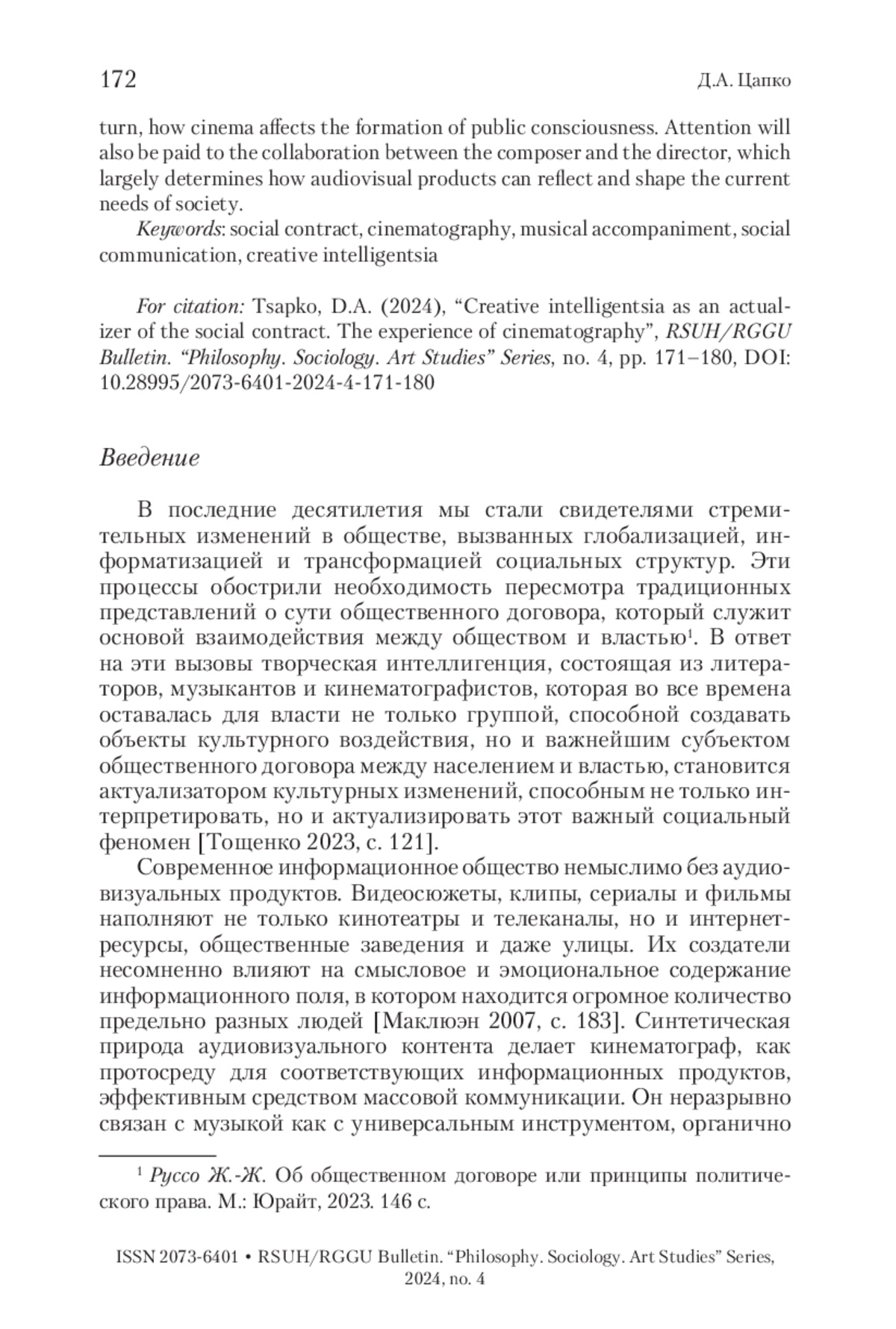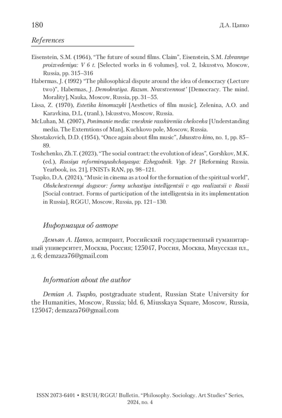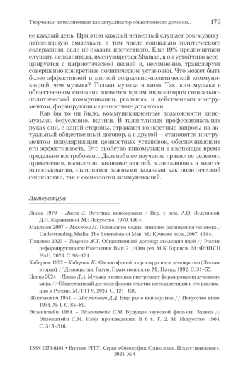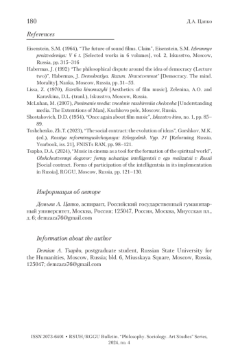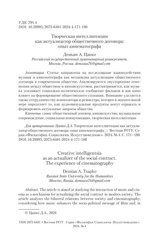 5. Цапко 2024 - Цапко Д.А. Музыка в кино как инструмент формирования духовного мира // Общественный договор: формы участия интеллигенции в его реализации в России. М.: РГГУ, 2024. С. 121-130.