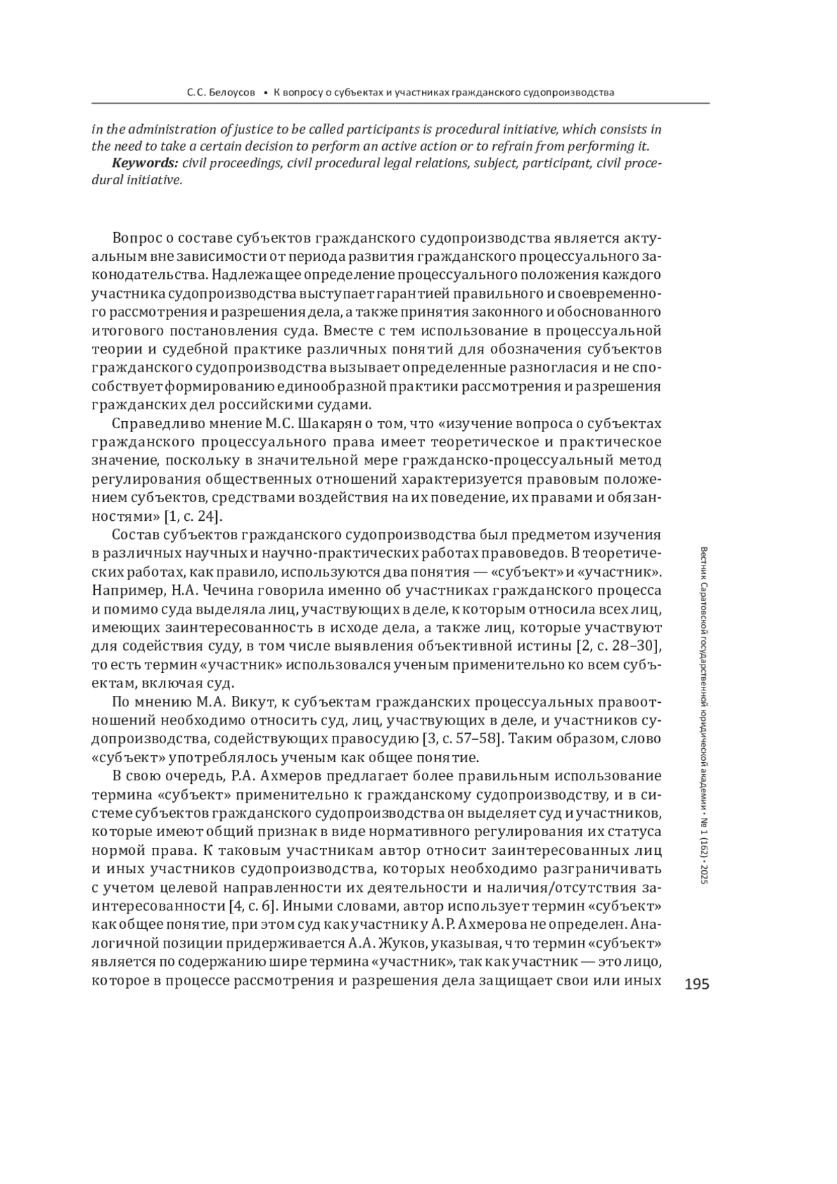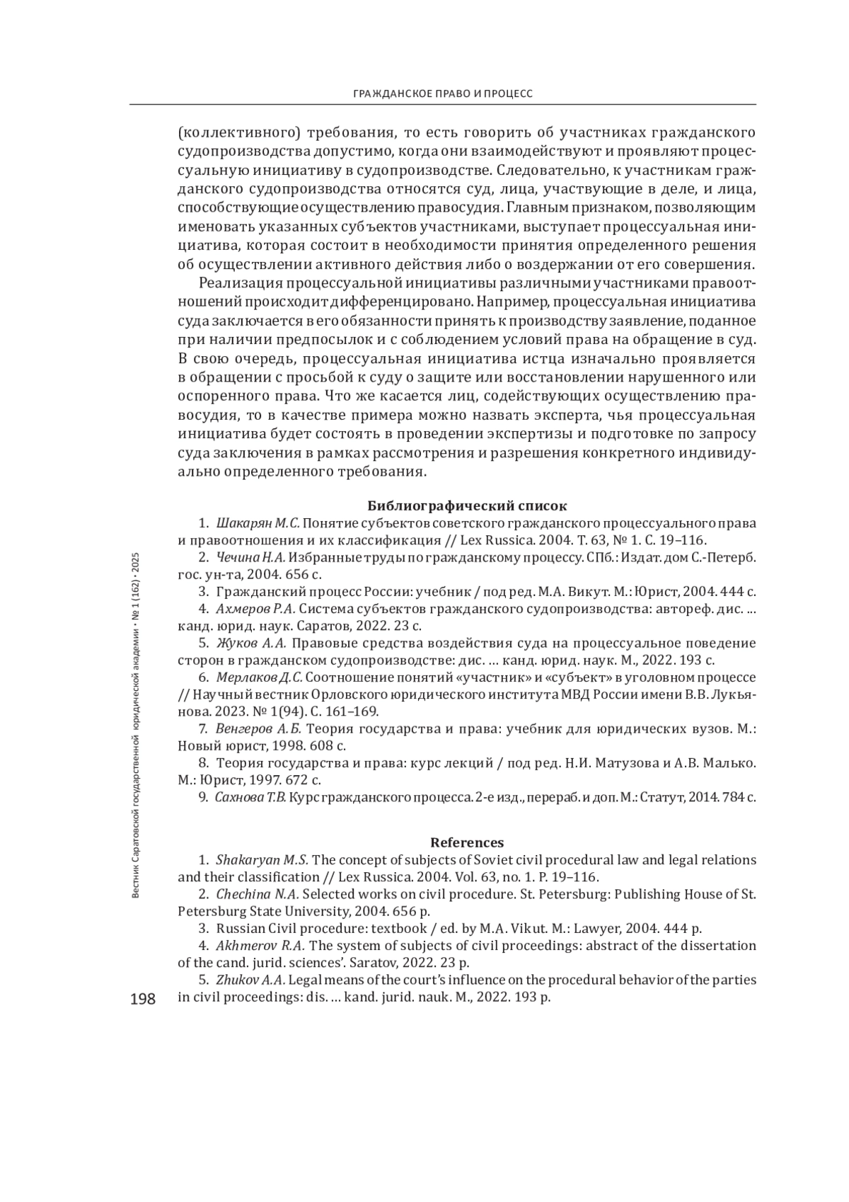 1. 	Шакарян М. С. Понятие субъектов советского гражданского процессуального права и правоотношения и их классификация // Lex Russica. 2004. Т. 63, № 1. С. 19-116.