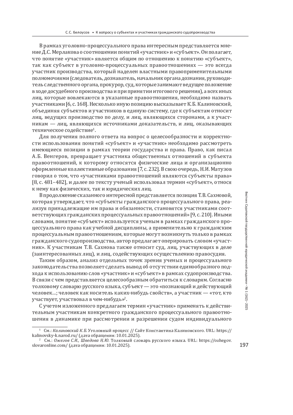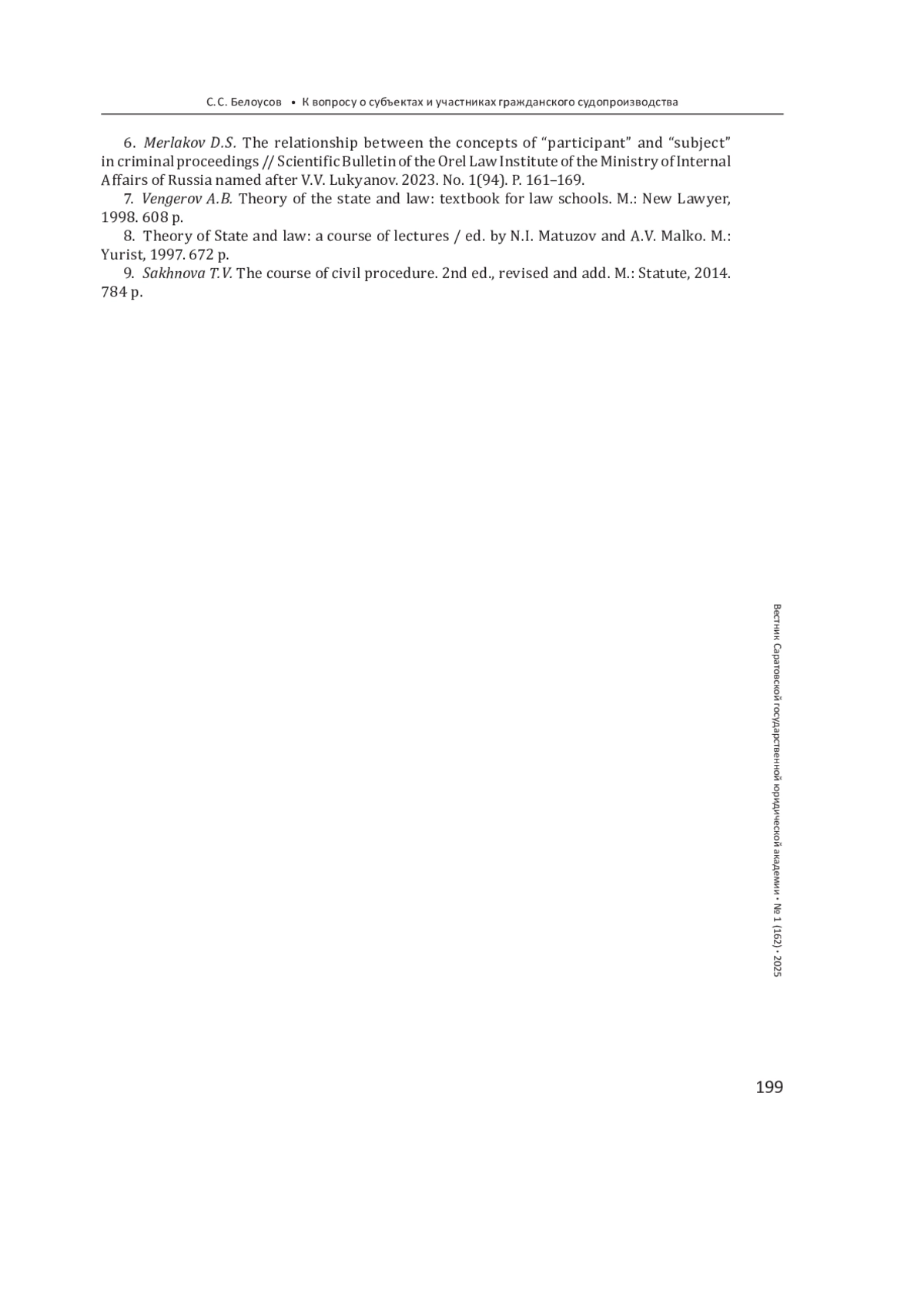 6. 	Мерлаков Д. С. Соотношение понятий “участник” и “субъект” в уголовном процессе // Научный вестник Орловского юридического института МВД России имени В. В. Лукьянова. 2023. № 1(94). С. 161-169. EDN: ELTPET