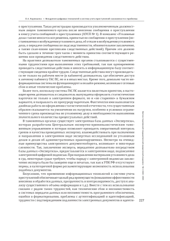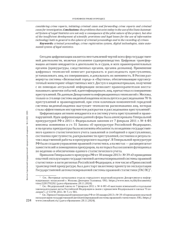 Выводы: проблемы, существующие сегодня в сфере использования Государственной автоматизированной системы правовой статистики, являются не только следствием пилотности проекта, но и недостаточной разработанностью научных положений и правовых основ применения информационных технологий как в целом в сфере уголовного судопроизводства, так и при учете преступлений.