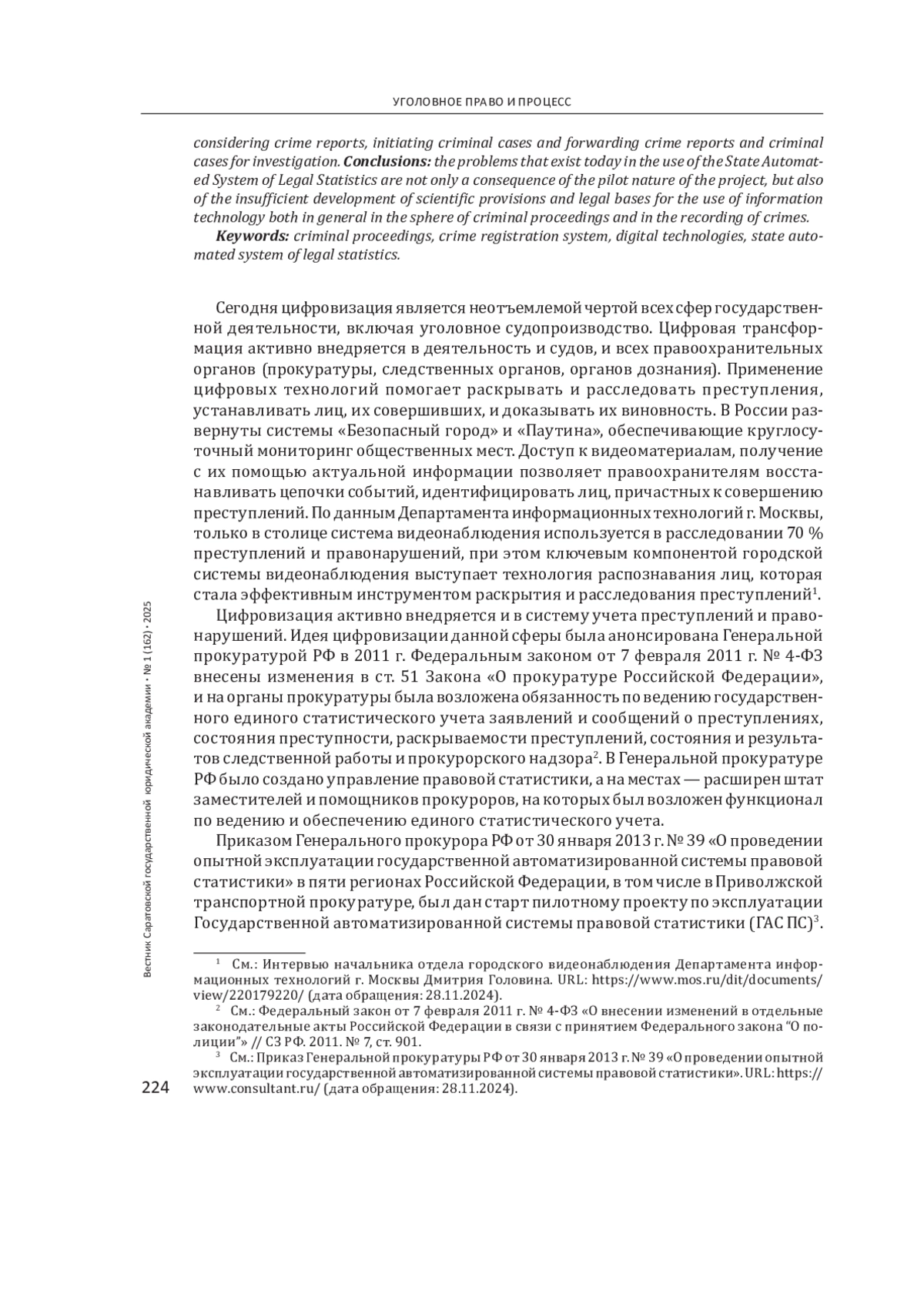 3. 	Приказ Генеральной прокуратуры Российской Федерации от 30 января 2013 г. № 39 “О проведении опытной эксплуатации государственной автоматизированной системы правовой статистики”. URL: https://www.consultant.ru/ (дата обращения 28.11.2024).