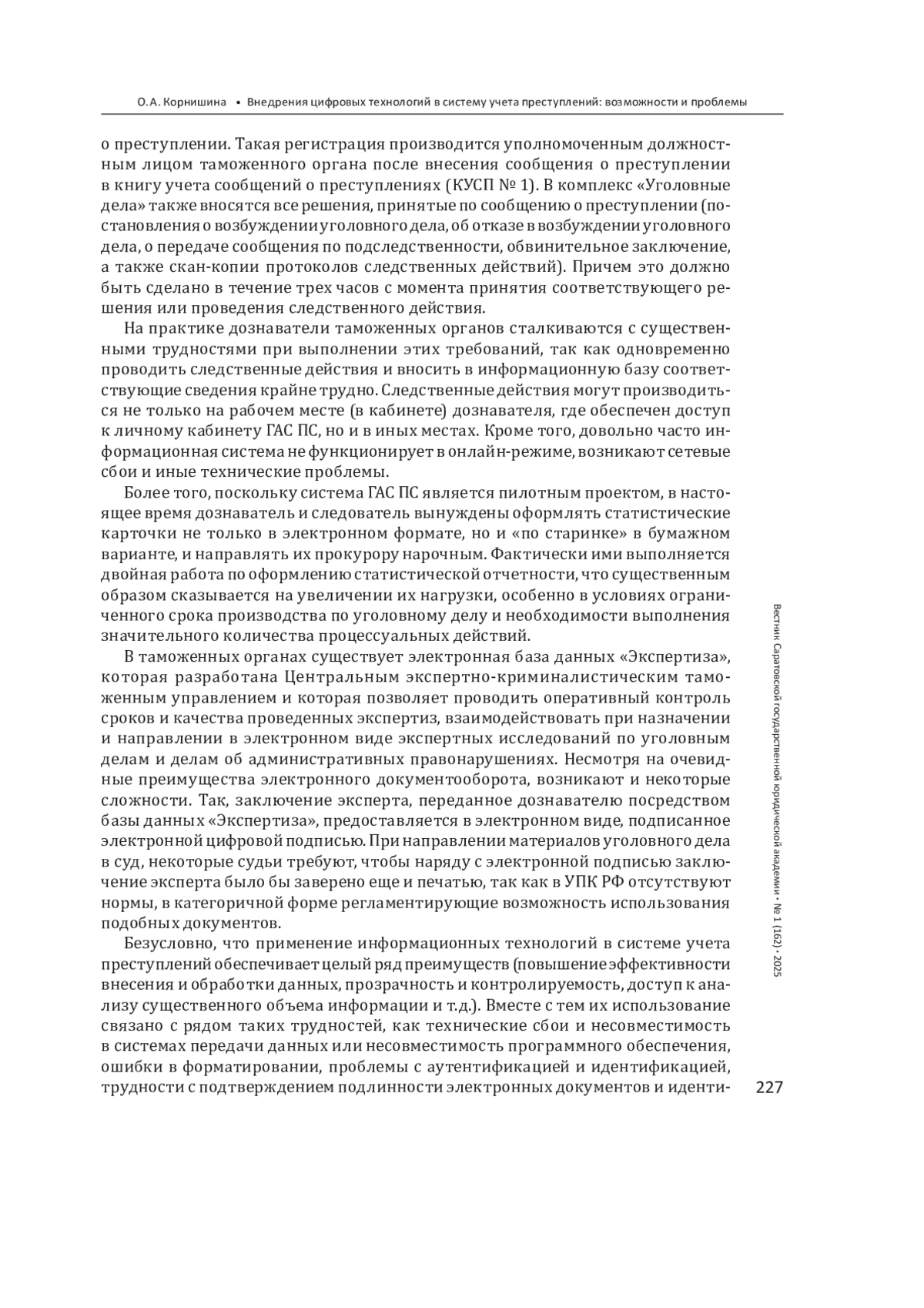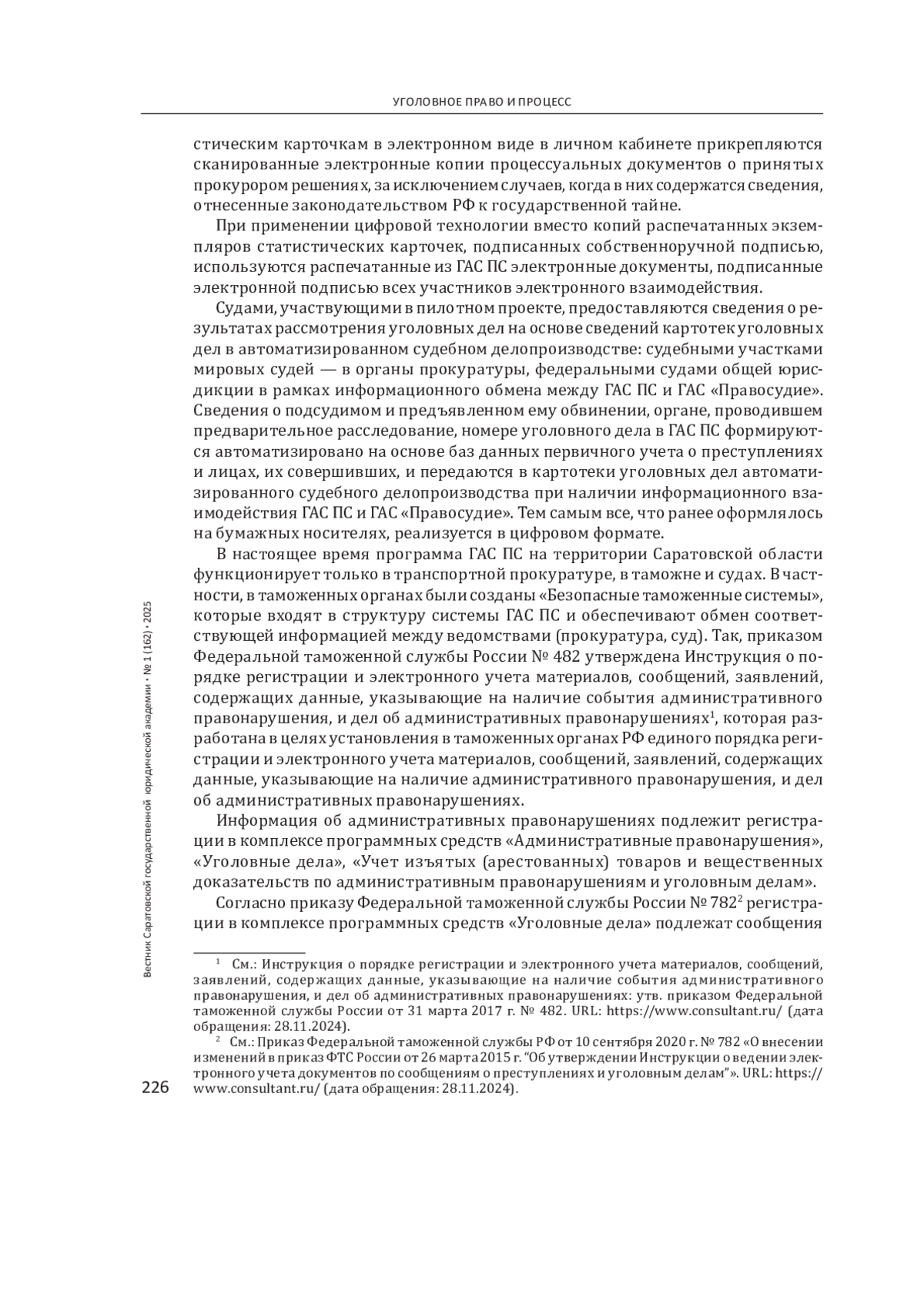 Результаты: несмотря на сложности и проблемы пилотного использования цифровой платформы ГАС ПС, организация единого информационного пространства в области уголовно-правовой статистики позволяет формировать полную и достоверную статистическую информацию, обмениваться информацией между следственными органами и прокуратурой при рассмотрении сообщений о преступлении, возбуждении уголовных дел и направлении сообщений о преступлении и уголовных дел по подследственности.