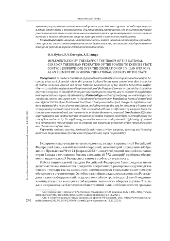 Введение: в современных условиях геополитической нестабильности обеспечение национальной безопасности становится ключевой задачей. Особую роль в этом процессе играет государственный контроль за оборотом гражданского оружия, осуществляемый войсками национальной гвардии Российской Федерации. Цель - изучить механизмы реализации полномочий Росгвардии по контролю за оборотом гражданского оружия, выявить их влияние на обеспечение безопасности государства, а также рассмотреть законодательные и организационные аспекты этой деятельности.