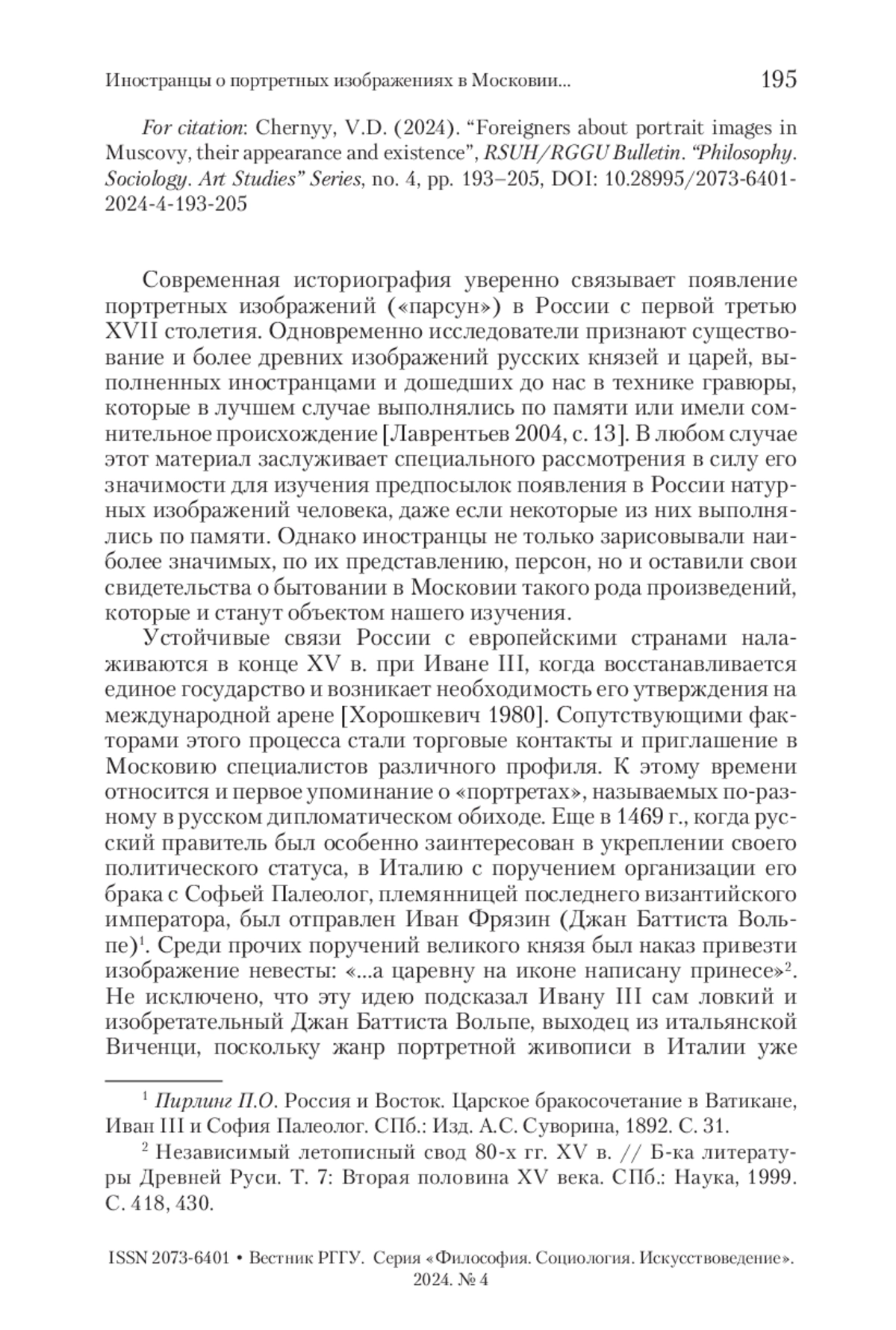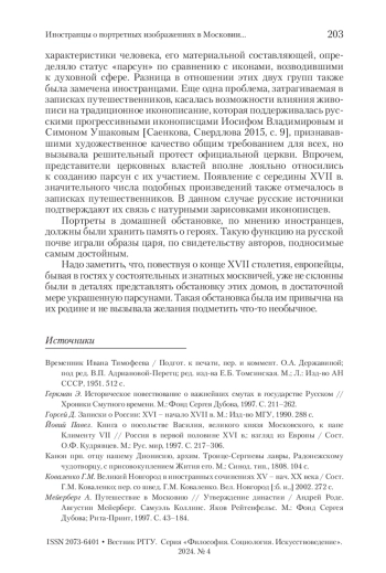 В статье рассматриваются свидетельства иностранцев о различных аспектах использования портретных изображений в России конца XV – XVII в. Начало их бытования отмечено в великокняжеской среде и связано с организацией политических браков. Контакты Московии с европейскими странами, особенно с середины XVI в., способствовали усилению интереса путешественников к личности царя. По этой причине появляются отдельные зарисовки и литературные портреты русских монархов. В ряде случает отмечается стремление к репрезентации через их изображения Московского царства, а иногда и личных заслуг. С XVII в., по свидетельству иностранцев, картинки с изображением царя и медали с его образом становятся своего рода наградными знаками. В сочинениях нашел отражение и вопрос о взаимоотношениях иконописи и светской живописи, о возможности использовать художественные достижения живописцев в иконописании, что в этот период вызывало категорическое несогласие Русской церкви. Одновременно авторы отмечали сосуществование в одной среде, например в торговых лавках или резиденции патриарха, икон и портретных изображений, в том числе церковных иерархов, написанных с натуры. С конца XVII столетия иностранцы отмечают широкое использование в домах знати и государственных чиновников светской живописи, в том числе портретов. Иностранцами чаще всего являлись европейские дипломаты и члены торговых компаний, которые руководствовались в своих оценках критериями, отвечающими привычной обстановке своих стран и соответствующими представлениям о портрете, его роли и художественных достоинствах. В целом их сведения и оценки позволяют почувствовать динамику изменения отношения в использовании портретных изображений в России в период Позднего Средневековья и в конечном счете готовность к усвоению европейских ценностей.