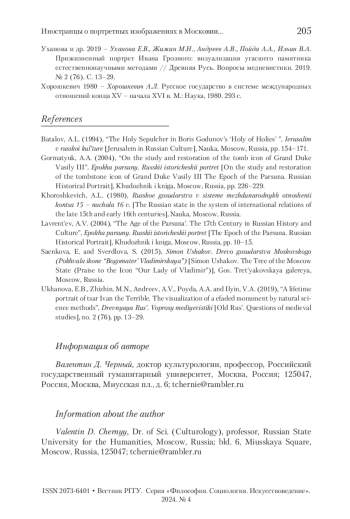 5. Уханова и др. 2019 - Уханова E.B., Жижин М.Н., Андреев А.В., Пойда А.А., Ильин В.А. Прижизненный портрет Ивана Грозного: визуализация угасшего памятника естественнонаучными методами // Древняя Русь. Вопросы медиевистики. 2019. № 2 (76). С. 13-29.