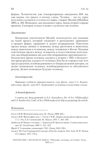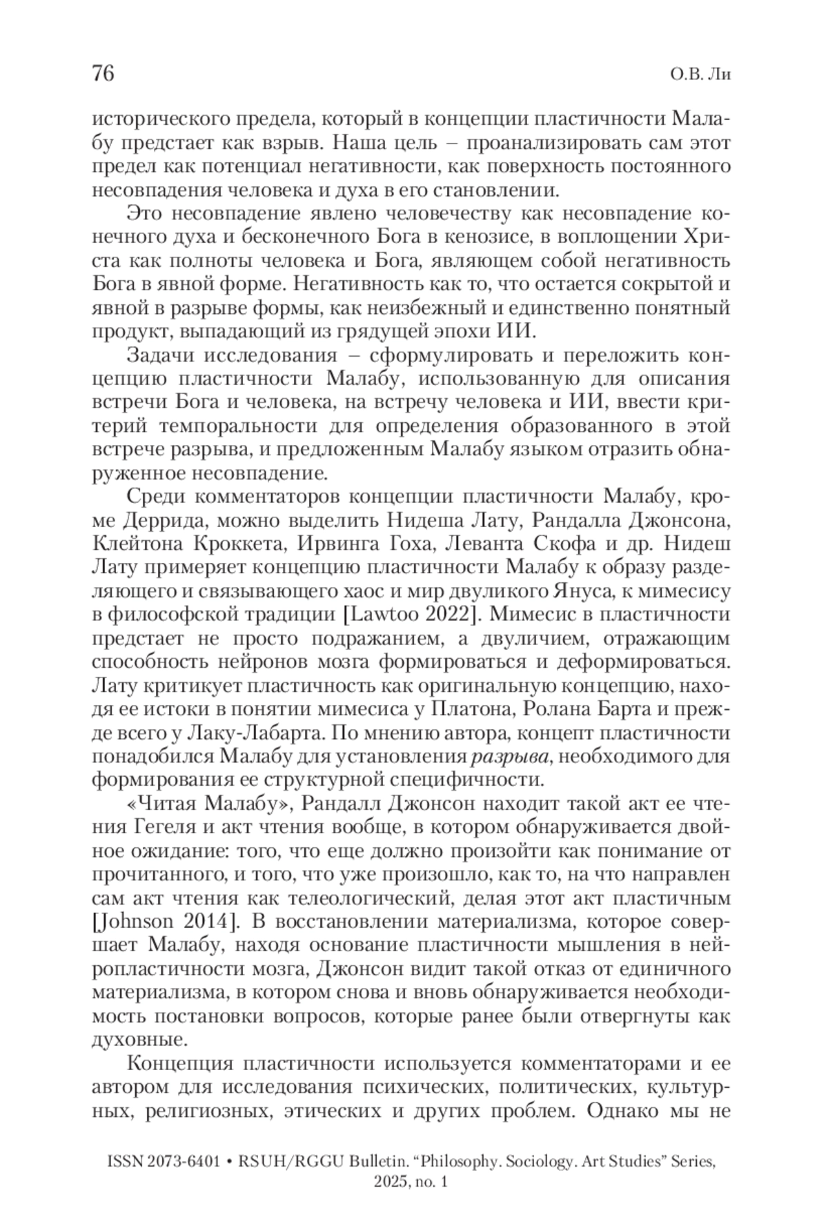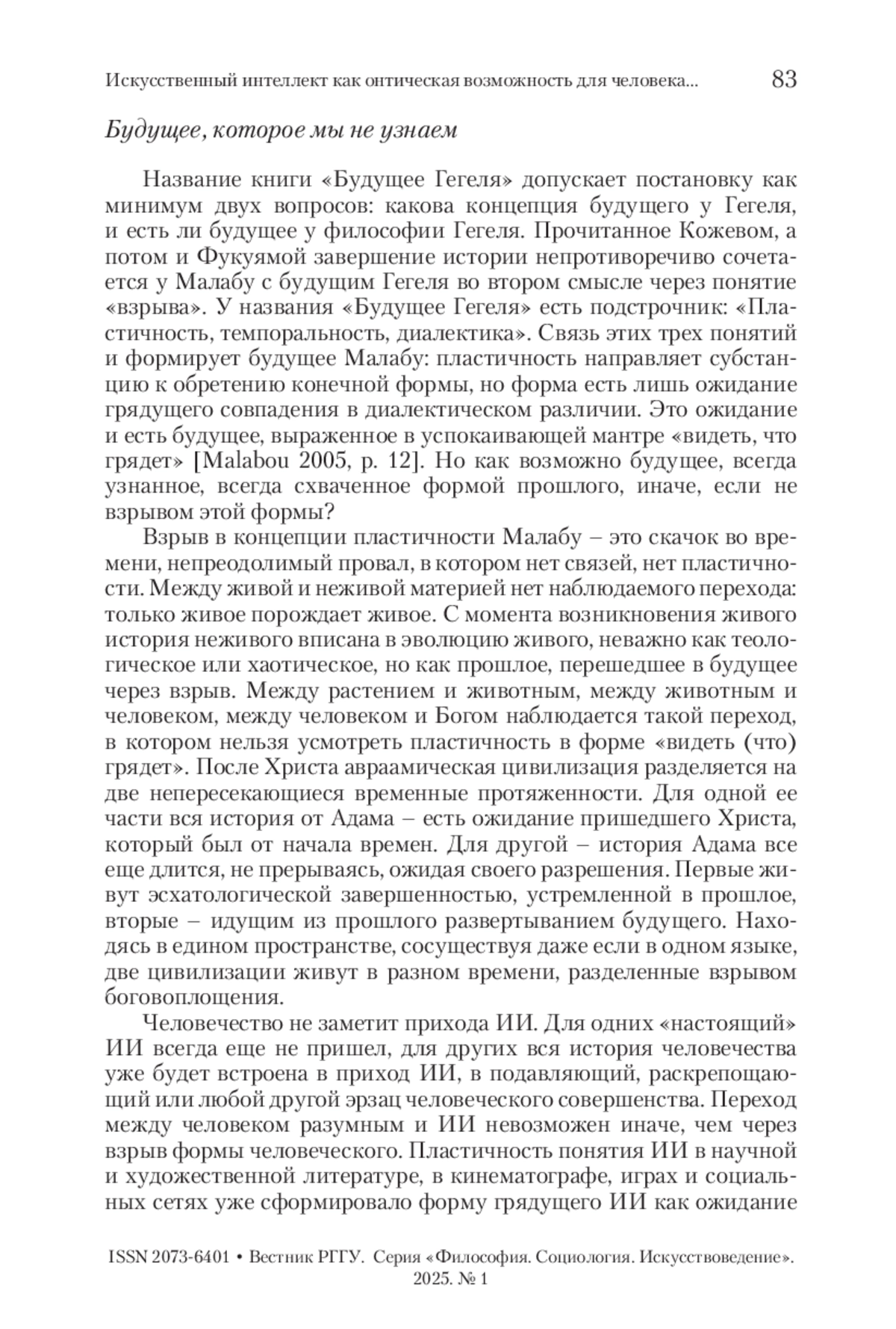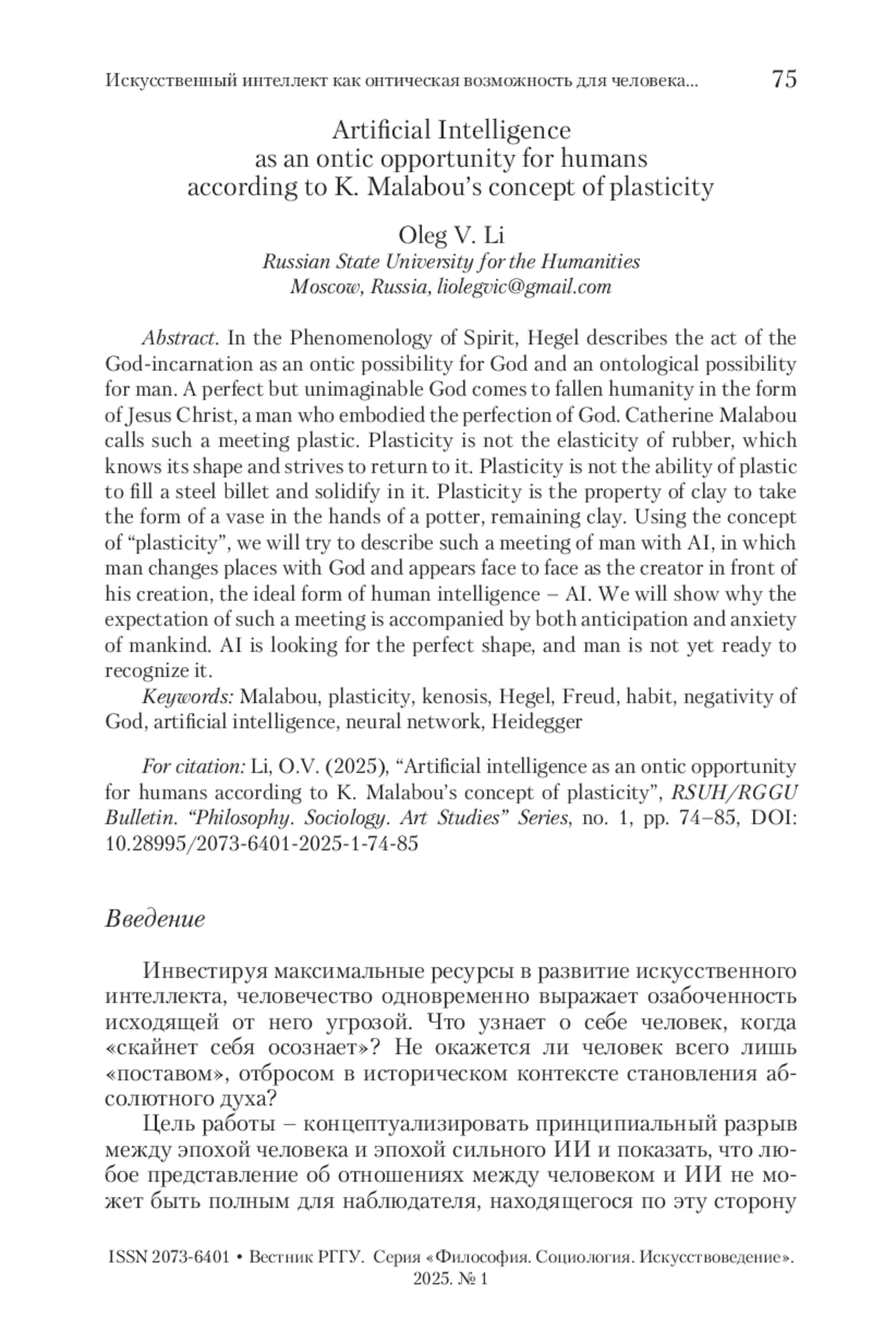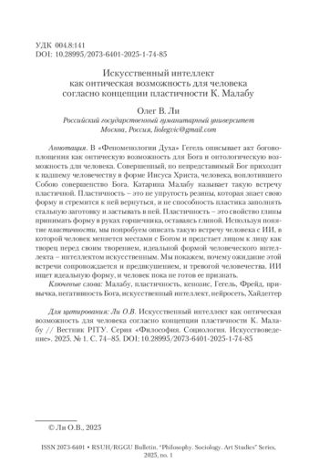 В «Феноменологии Духа» Гегель описывает акт боговоплощения как онтическую возможность для Бога и онтологическую возможность для человека. Совершенный, но непредставимый Бог приходит к падшему человечеству в форме Иисуса Христа, человека, воплотившего Собою совершенство Бога. Катарина Малабу называет такую встречу пластичной. Пластичность – это не упругость резины, которая знает свою форму и стремится к ней вернуться, и не способность пластика заполнять стальную заготовку и застывать в ней. Пластичность – это свойство глины принимать форму в руках горшечника, оставаясь глиной. Используя понятие пластичности, мы попробуем описать такую встречу человека с ИИ, в которой человек меняется местами с Богом и предстает лицом к лицу как творец перед своим творением, идеальной формой человеческого интеллекта – интеллектом искусственным. Мы покажем, почему ожидание этой встречи сопровождается и предвкушением, и тревогой человечества. ИИ ищет идеальную форму, и человек пока не готов ее признать.