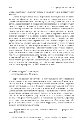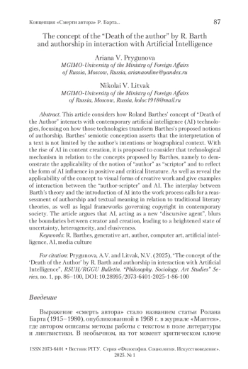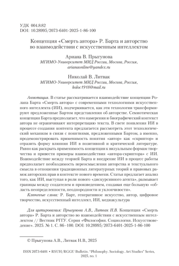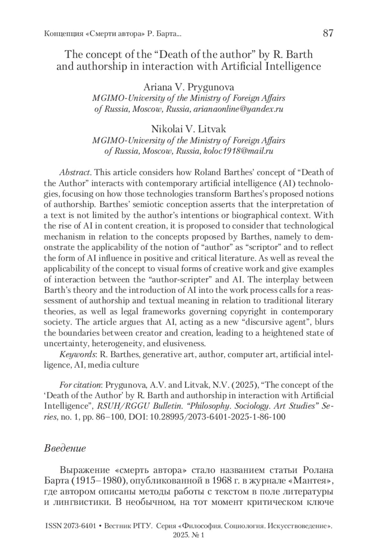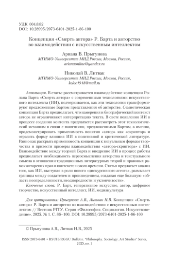 В статье рассматривается взаимодействие концепции Ролана Барта «Смерть автора» с современными технологиями искусственного интеллекта (ИИ), подчеркивается, как эти технологии трансформируют предложенные Бартом представления об авторстве. Семиотическая концепция Барта предполагает, что намерения и биографический контекст автора не ограничивают интерпретацию текста. В свете появления ИИ в процессе создания контента предлагается рассмотреть этот технологический механизм в связи с понятиями, предложенными Бартом, а именно, продемонстрировать применимость понятия «автор» как «скриптор» и отразить форму влияния ИИ в позитивной и критической литературе. Равно как раскрыть применимость концепции к визуальным формам творчества и привести примеры взаимодействия «автора-скриптора» с ИИ. Взаимодействие между теорией Барта и внедрение ИИ в процесс работы предполагает необходимость переосмысления авторства и текстуального смысла в отношении традиционных литературных теорий и правовых рамок авторских прав в контексте нового времени. Статья предлагает анализ того, как ИИ, выступая в роли нового «дискурсивного агента», размывает границы между создателем и произведением, создавая еще большую «область неопределенности, неоднородности и уклончивости».
