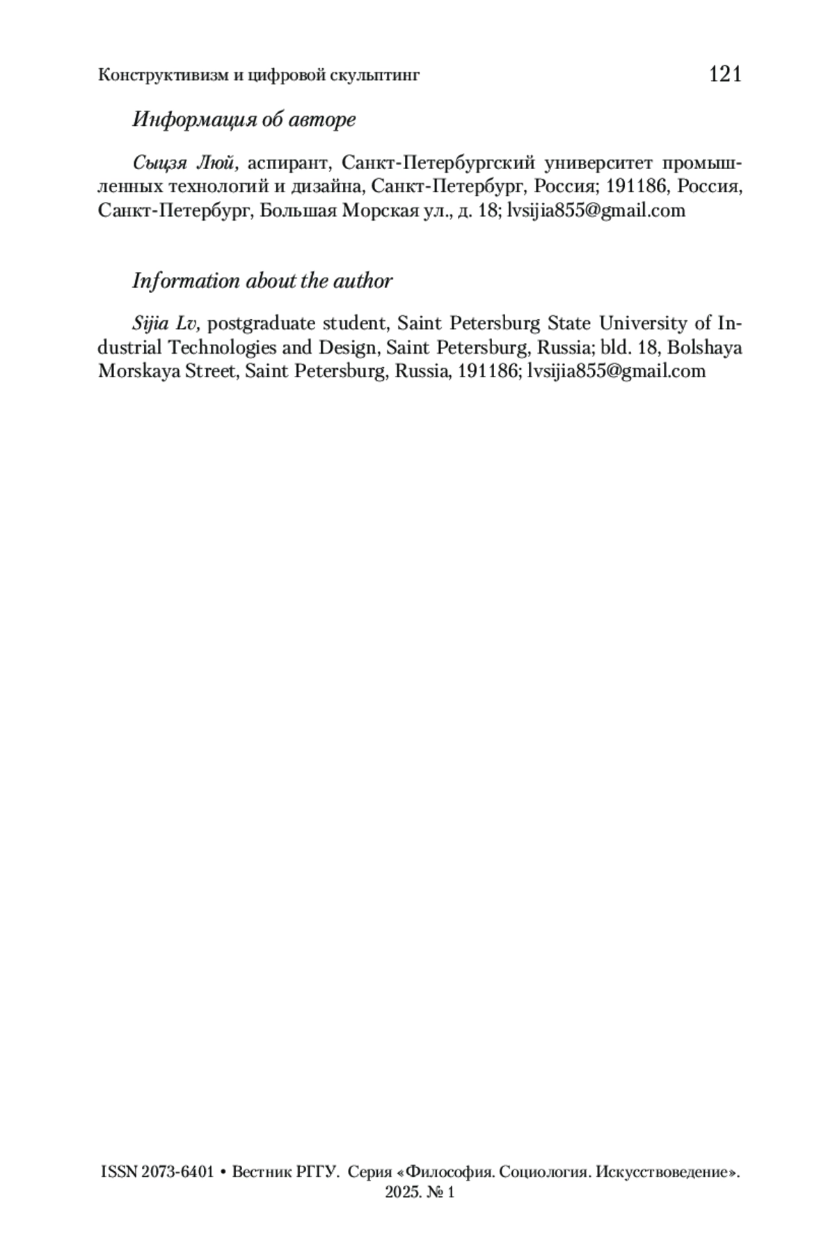 Благодаря слиянию современного искусства и технологий цифровая скульптура постепенно становится важной областью исторических исследований современного искусства. Как новая форма художественного выражения, цифровая скульптура находится в периоде концептуализации и отделения от традиционной скульптуры. В статье анализируется влияние конструктивизма на формирование форм цифровой скульптуры; например, работы цифровых художников Джамы Джурабаева и Сюй Чжэлуна отражают применение конструктивистских принципов в цифровой скульптуре. Благодаря использованию цифровых технологий их работы деконструируют и реорганизуют форму и пространство традиционной скульптуры, создавая цифровые скульптуры с ощущением динамизма и интерактивности. Эти работы не только демонстрируют точность и гибкость цифровых технологий, но и отражают конструктивистскую концепцию социального конструирования знаний и форм искусства. В контексте цифровой эпохи цифровая скульптура – это комплексная форма искусства, объединяющая в себе темпоральность и динамизм, которая не только бросает вызов созданию и восприятию традиционной скульптуры, но и предоставляет художникам неограниченные творческие возможности и экспериментальное пространство. С непрерывным прогрессом цифровых технологий цифровая скульптура будет продолжать исследовать новые художественные выражения и концепции, привнося новые изменения и развитие в современное искусство.