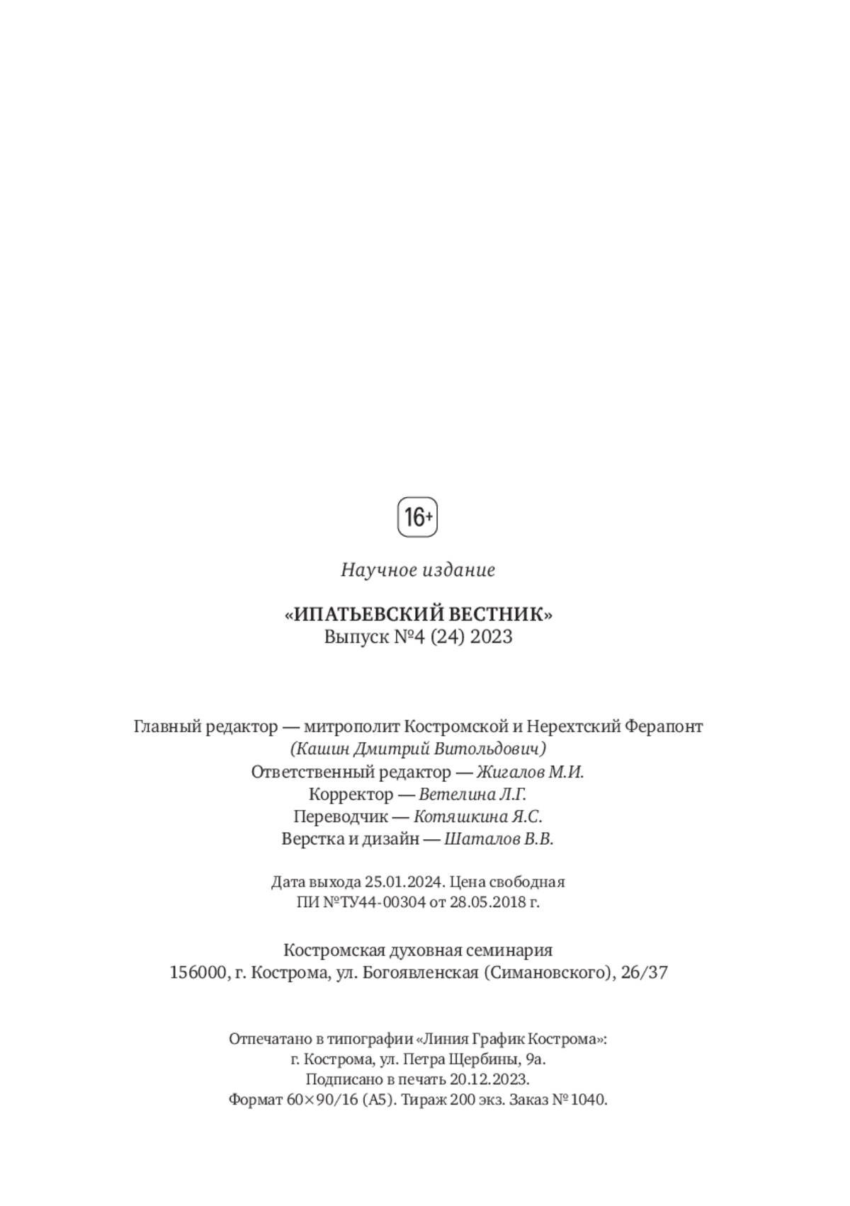 Попов А.Д., диак. Литургические заметки и отдельные прошения “Служебника” в последовании Божественной Литургии: отличие от практики начала XXI столетия // Ипатьевский вестник. - 2023. - №4. - С.25-34.